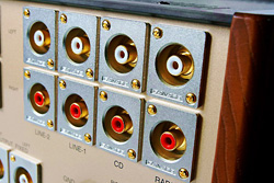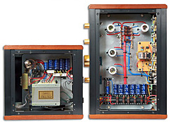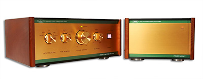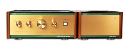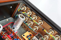 Now the Leben is, and will remain a device with its own character. It will always sound in a way making the recording carry a secret, that promoted discs having some kind of a message, directed in some way, like the The Final Cut Pink Floyd (EMI Records/Toshiba-EMI, TOCP-67407, CD; this is one of the “Dutch Japanese”, directly from Uden, where the disc was pressed. Despite this it sounds splendid…) or In The Court Of The Crimson King King Crimson (Universal, UICE-9051, HDCD). And the early digital recordings from Peter Gabriel from the disc Security (Geffen, 2011-2, CD; not remastered version) sounded in a very intreaguing, deep way. But every time I missed the strong treble, as from the Ancient Audio system, to be fully satisfied. Here one can see the not so high price of this classy equipment. I think that only a switch to the VK-52SE or others in that price level can better that aspect. And I need to repeat this again – it is not about the withdrawal of the treble in the Leben, but about the saturation of the midrange that makes the treble retreat. There is still much information, especially with good XRCD discs, but it can be done better. It is also worth to take a look at the bass. There is a lot of it and it goes far down. It happened for the first time, that I felt the need to plug one of the bass-reflex ports of the Harpias, because my room turned out to be too small for this all. I remember well the brilliant bass of the Krell, that went down just as far. With the American system it was so brilliantly controlled, that even full power in some – I do not now which, but I just report what I heard – way did not require combinations with the loudspeakers. There is some “guilt” of the Harpia in this, because the speakers go far down without any compression, and one should be very careful with their application. Anyway, I am buying this idea of sounding (here the “buying” is in parentheses) as well as the Leben itself (here the buying is in its literal sense). I know it has its flaws, but for the money they are just nothing. Probably I will exchange it for something else sometimes, but first I will have to save some money. And if there would be a remote… DESCRIPTION ![]() The Leben preamplifier consists of two elements: the main unit with the preamplifier circuitry and the power supply. Both elements are made identically, so they can be placed next to each other, or better somewhat separated, but the power supply does not have to be hidden. The main unit is small, the width is even smaller than that of my Prime. The visual design is typical for this manufacturer, we have a golden front panel with green stripes on the top and bottom, gold plated knobs and wooden side panels. This description is valid also for the power supply. Unlike the CS-300 amplifier, the preamp has a thick front panel – this is an extra layer of aluminum. The chassis is screwed together from thick aluminum profiles, with the side panels being screwed to those. In the front we have four knobs and a switch. Looking from left we have the input selector – we can choose from four line inputs and one MM turntable input; the tape loop selector, allowing to monitor the recording on a three head tape deck, a large volume knob and a balance knob. To the right is a red lit power switch, with two LEDs (one red above it, and one green above the volume knob). The first one, while blinking, indicates that the device is still powering up, the output being muted and the anode voltage off. When it stops blinking and switches off the green LED lights up, showing the device is ready. Two words – I think that it would be more logical to make the power switch in the shape of a knob and place both LEDs next to it. And in the back a very beautiful sight! Let us say about the sockets. Those are superb, extremely durable sockets from Canare RJ-RU with gold plated pins made from beryllium and copper. They look quite different than standard sockets and probably their shape was taken from Neutrik sockets, that uses them for years – the sockets are mounted in rigid montage elements and intruded in the back plate. Let us just mention, that sockets like this are used by the American company Boulder. We have four line inputs, a tape loop, MM gramophone input and two power amplifier outputs – one directly from the output tubes, and the other variable, there is an open Alps potentiometer, allowing to adjust the output volume level to match two different power amplifiers. Next to the MM input there is a turntable grounding post, and in the edge there is a socket for the power supply cable. That cable is reasonable, but without exaggeration, however the socket and plug are very solid and writhed.