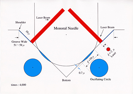 The idea of those turntables was somewhat similar to a CD, quite simple, but difficult to implement in practice. The disc in this device (ELP Laser Turntable) was placed on a big tray, looking like a giant version of the Stable Platter Mechanism from Pioneer. After closing the tray the disc was scanned by a laser to detect the gaps between the tracks, and the result was displayed just like on a CD player. So the user was able to skip tracks just like on a CD. But still the readout mechanism was most important. The grooves were read by two laser beams. This readout was absolutely analog, no digital processing was employed anywhere in the sound path.