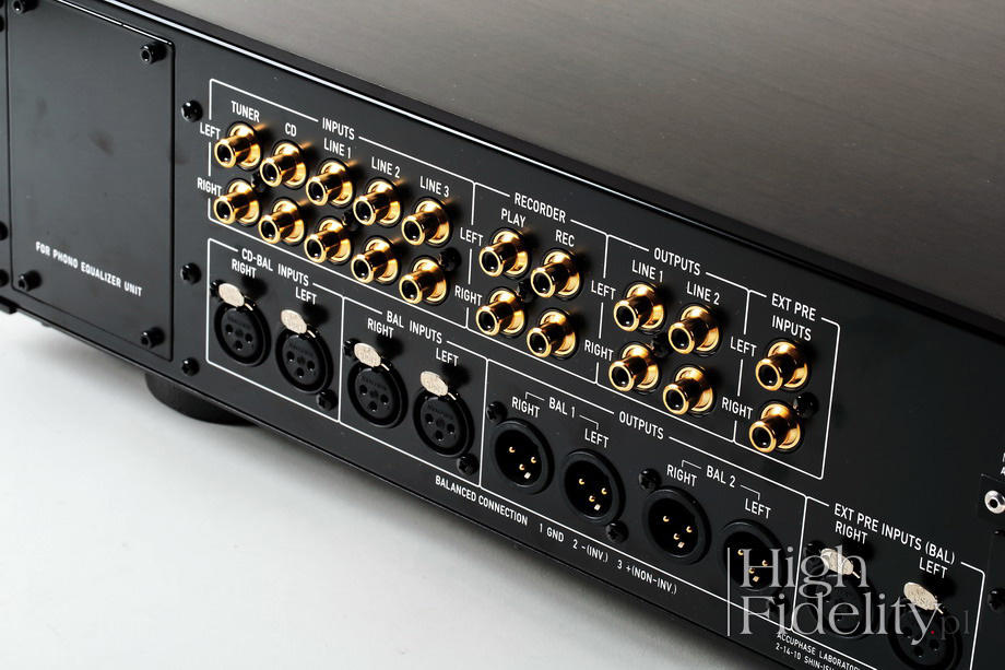 Zmiany te można podzielić na: parametry mierzalne, konstrukcję mechaniczną, funkcjonalność oraz wykończenie. Parametry, które mają znaczenie dla przedwzmacniacza liniowego i uznawane przez inżynierów Accuphase’a za najważniejsze to zazwyczaj szumy. W konstrukcji mechanicznej zwraca się obecnie uwagę na drobne poprawki, ponieważ „szkielet” na którym opierają się kolejne generacje urządzeń został opracowany już dawno. Ale właśnie takie drobne zmiany, powiązane z poprawkami technicznymi dają największe różnice w dźwięku. Funkcjonalność z kolei jest odzwierciedleniem potrzeb rynku i tego, jak na nie reagują ludzie z Accuphase’a – w przypadku C-2450 widać, że w centrum ich zainteresowań znalazła się czarna płyta. I wreszcie wykończenie – choć urządzenia tej firmy wydają się do siebie bardzo podobne, to właśnie dizajn pozwala na umiejscowienie ich w czasie. | C-2450 Model C-2450 jest czwartą generacją przedwzmacniaczy z serii ‘2400’, otwartej w sierpniu 2003 roku modelem o tym właśnie symbolu. Wygląda absolutnie klasycznie, tj. ma złoty front, opuszczaną klapkę pod którą ukryto przyciski i gałki, a także szklane „okienko” za którym widać podświetlane napisy, bursztynowe diody LED oraz wyświetlacze, na których odczytamy siłę głosu oraz obciążenie wkładki gramofonowej. Ta ostatnia funkcja jest dostępna, jeśli przedwzmacniacz wyposażymy w opcjonalną kartę przedwzmacniacza gramofonowego MM/MC, nowy model o symbolu AD-2850. Urządzenie obsługuje się bezbłędnie, a to dzięki dużym gałkom zmiany wejść oraz siły głosu. Budowa | Robiliśmy to już wielokrotnie, wystarczy więc przypomnieć, że urządzenia tej firmy to wzór precyzji, rzetelności i zdrowego rozsądku. Obudowę wykonano z kilku stalowych i aluminiowych warstw, a front z grubego aluminium, anodowanego na kolor złoty („szampański”). Z aluminium wykonane są także gałki i przyciski. Jak zaraz pokażemy to jeden z nielicznych XXI-wiecznych przykładów na funkcjonalne apogeum, ale postarano się, aby to bogactwo nie przytłaczało, chowając większość manipulatorów pod opuszczaną klapką. Boki zostały oklejone materiałem imitującym drewno, a górną ściankę wykończono w inny sposób niż wcześniejszy model. Firma mówi o „hair-line”, sposobie mającym – jak mówią materiały firmowe – poprawić wygląd urządzenia. Urządzenie ma budowę zbalansowaną (symetryczną) na wejściu i niesymetryczną na wyjściu, ale mamy zarówno wejścia i wyjścia niezbalansowane RCA, jak i zbalansowane XLR. Jest ich mnóstwo – proszę rzucić okiem na zdjęcia. Gniazda XLR są okablowane w sposób „amerykański”, będący obecnie wyłącznie „japońskim”, tj. z „gorącym” pinem nr 3. Aby ustalić fazę absolutną całego systemu inżynierowie Accuphase’a, wyposażyli przedwzmacniacz w guzik, którym możemy ją zmienić. Środek zajęty jest głównie przez układ regulacji siły głosu AAVA oraz zasilacz; całość ma budowę dual-mono. Osobne transformatory zasilające zaekranowano i umieszczono tuż przy układach AAVA. Poszczególne sekcje są od siebie oddzielone metalowymi ekranami, które usztywniają całą strukturę. Także układ regulacji siły głosu przykryto aluminiowymi, anodowanymi na złoto kratkami. Zmontowano go na trzech płytkach (na kanał), w których mamy bufor wejściowy, układ AAVA oraz sekcję wzmacniającą, będącą też buforem wyjściowym. Na płytce przy przedniej ściance umieszczono filtry, regulację barwy dźwięku oraz wzmacniacz słuchawkowy. Ten ostatni korzysta z układów wzmocnienia przedwzmacniacza do którego dodano stopień prądowy. Wszystkie sekcje zbudowano z wykorzystaniem układów scalonych. Funkcjonalność | To wszechstronny i wyjątkowo funkcjonalny przedwzmacniacz, ale Accuphase innych nie produkuje. Jego pełna nazwa brzmi: „Precision Stereo Control Center C-2450”. Oferuje sześć wejść liniowych niezbalansowanych RCA, dwa wejścia liniowe zbalansowane XLR, wejście i wyjście do nagrywania, a także dwa wejścia gramofonowe, dostępne po dodaniu opcjonalnej karty; te ostatnie aktywowane są tą samą gałką „Source”, co pozostałe. Są także dwa stereofoniczne wejścia bezpośrednio na końcówkę mocy – niezbalansowane RCA i zbalansowane XLR. Wyjść też jest sporo, bo oprócz nieregulowanego, do nagrywania, mamy również dwie pary wyjść niezbalansowanych z przedwzmacniacza oraz dwie pary wyjść zbalansowanych XLR, też z przedwzmacniacza. Użytkownik może wybrać aktywne wyjście, mamy też wzmacniacz słuchawkowy, jak i zmianę wzmocnienia: +12/18/24 dB. Małymi gałeczkami zmienimy także barwę: ±5 dB przy 300 Hz oraz 3 kHz. Można także zmienić ją skokowo, korzystając z przycisku „Loudness”: +6 dB przy 100 Hz. Jeśli chcemy na chwilę przyciszyć dźwięk, ale nie całkiem, na przykład żeby odebrać telefon, albo usłyszeć, co mówi do nas „druga połówka”, wystarczy wcisnąć przycisk „Attenuator”, który tłumi sygnał o 20 dB. Dodajmy do tego, zmianę fazy absolutnej, przycisk „mute” i inne. Nieprzypadkowo pisałem o gramofonie, ponieważ to jeden z mocniejszych akcentów postawionych w tym modelu przez japońskich inżynierów. To urządzenie, które w najpełniejszy sposób – jak dotychczas – integruje opcjonalną kartę z samym przedwzmacniaczem. Oprócz wyświetlania ustawień obciążenia mamy bowiem do dyspozycji dwa przyciski, przy tunerze FM powiedzielibyśmy: „presety”, AD1 oraz AD2, pod którymi można „zapamiętać” dwa osobne ustawienia obciążenia wkładki. Są one połączone z dwoma, osobnymi wejściami dla gramofonu w karcie AD-2850. C-2450 wyposażony jest we wzmacniacz słuchawkowy. Postarano się, aby był w stanie wysterować dowolne konstrukcje, dlatego pod uchylną klapką znajdziemy przycisk „High” podnoszący wzmocnienie układu wyjściowego o 10 dB. Jego na
