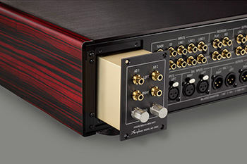 Wejście pierwszego stopnia zbudowane jest na osobnym układzie, w którym sygnał dla wejścia MC wzmacniany jest w tranzystorach bipolarnych, a dla wejścia MM w tranzystorach J-FET („Junction-FET”). Ma się charakteryzować ultraniskimi szumami, które w stosunku do poprzedniego modelu AD-2820 zmalały o 10%. Wzmacniacz korekcyjny RIAA ma zbalansowane wejście i jest zaprojektowany tak, aby zminimalizować błędy krzywej korekcji przy zmianie wzmocnienia całego układu. Firma mówi o wartościach nie przekraczających +/-0,2 dB. Wszystkie funkcje, takie jak wzmocnienie i obciążenie, dostępne są z przedniego panelu przedwzmacniacza. Zmiany | Przy opisie tej karty zwrócono uwagę na niższe szumy niż w poprzednich wersjach. Podobnie rzecz się ma z samym przedwzmacniaczem. Jak czytamy, w porównaniu do zastępowanego modelu C-2420, nowy ma szumy niższe o 10%, co oznacza, że wynoszą -122 dBV, a stosunek sygnał/szum 110 dB. To tzw. „gwarantowany” poziom, poniżej którego żaden z egzemplarzy nie ma prawa zejść. W rzeczywistości jest zazwyczaj lepszy.