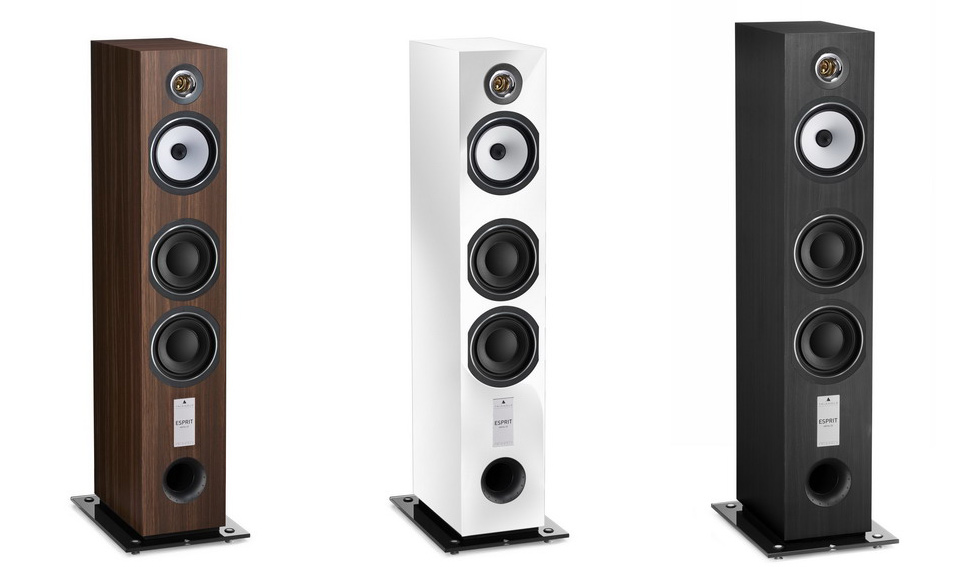 Zwrotnica | W zwrotnicach wszystkich kolumn z serii Esprit zastosowano komponenty wysokiej jakości, w tym miedziane cewki o średnicy 1 mm oraz kondensatory MET (Metallized Polyester Film). Terminale głośnikowe wykonano ze szczotkowanego aluminium, który to materiał nie tylko efektownie się prezentuje, ale jednocześnie ma właściwości antywibracyjne. Jak pisze producent, w celu zapewnienia najwyższej jakości połączenia, każdy terminal wyposażony jest w miedziane zaciski z samozamykającym systemem dedykowanym wtykom bananowym. Terminale głośnikowe przyjmują jednakże nie tylko banany, ale i widełki, bądź nawet gołe kable. Cokół | Obudowy ustawiono na oryginalnych, szklanych cokołach. Szkło połączono z perforowaną gumą, co zapewnia skuteczne tłumienie wibracji, a jednocześnie wymiary cokołów zapewniają kolumnom odpowiednią stabilność. W zestawie znajdują się dwa zestawy nóżek – aluminiowe stożki i gumowe nóżki na delikatne podłogi. Nawet te pierwsze są osadzone w gumowych kołnierzach i wpycha się je w stosowne otwory w szklanych płytach. Rozwiązanie to z jednej strony eleganckie, z drugiej samo w sobie stanowi element absorpcji niechcianych wibracji. ![]() Dane techniczne (wg producenta) Konstrukcja: trójdrożna, bas-refleks |