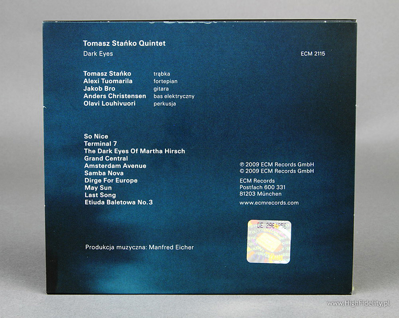 Program: 1. So Nice 2. Terminal 7 3. The Dark Eyes Of Martha Hirsch 4. Grand Central 5. Amsterdam Avenue 6. Samba Nova 7. Dirge For Europe 8. May Sun 9. Last Song 10. Etiuda Baletowa No. 3 Personel: Tomasz Stańko – trąbka Alexi Tuomarila – fortepian Jakob Bro – gitara Andres Christensen – kontrabas Olavi Louhivuori – perkusja   To pierwsza płyta ECM wydana w Polsce w ramach kampanii „Polska cena”. Choć większość płyt na tym traci, bo mają lichą poligrafię i tłoczone są najczęściej w Polsce z kopii taśm-matek kolejnych generacji, to ze Stańką jest inaczej – choć na wkładce i kartoniku znajdziemy polskie opisy, to poligrafia jest fantastyczna. A i płyta została wytłoczona klasycznie, w Niemczech, w tłoczni EDC. Nagranie dokonane zostało w technice cyfrowej i tak też została płyta zmiksowana. Dokładnie w ten sam sposób mógłbym opisać dźwięk tej płyty. To wciąż realizacja ECM-u, tj. doskonale zrównoważona, fantastycznie rozdzielcza i przepięknie osadzona w otoczeniu akustycznym. W odróżnieniu od chociażby Lontano, dźwięk tutaj jest nieco cieplejszy (oczywiście w ramach ECM-owskiego paradygmatu). Fortepian jest nieco pełniejszy i cięższy. To samo dotyczy perkusji – jej blachy mają ładniej uchwyconą „wagę” i pełnię. Nie są już tylko rozdzielcze, ale i naturalne. Trąbka lidera jest bliżej niż wcześniej, ma pełniejszą barwę. To wszystko dobrze, to znakomicie. Przestrzeń nie jest tak duża, tak „chłodna”, jak wcześniej. Ponieważ wszystkie instrumenty są nieco bliżej, a pogłos jest cieplejszy, to i zespół wydaje się bardziej intymny. Podkreśla to nastrój płyty – kontemplacyjny i opisowy.  Dystrybucja: Universal Music Polska Japońskie wersje płyt dostępne na: CD Japan. |        |
