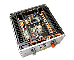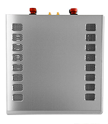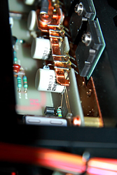 A środek wygląda przepięknie – jak wzmacniacze Accuphase’a, a może nawet lepiej. Podzielono go ekranami na kilka sekcji – po bokach końcówki, pośrodku zasilacz. Końcówki, pracujące w klasie A, w trybie push-pull. Na kanał przypada szesnaście tranzystorów Toshiby 2SC5200+2SA1943, a więc tranzystorów bipolarnych. Zazwyczaj stosuje się tutaj MOSFET-y ze względu na ich przyjemniejsze, podobne do lampowego, brzmienie. Tranzystory unipolarne są jednak niemal nie do sparowania – nie da się złożyć push-pullu z idealnie takim samym tranzystorem z kanałem N i P. Niektóre firmy, jak np. Creek, stosują więc układ quasi-komplementarny, w którym dochodzi jednak problem z odwracaniem fazy. W każdym razie, końcówki są w pełni tranzystorowe , a w prowadzeniu masy posłużono się grubymi, miedzianymi szynami. W ogóle miedź i elementy miedziowane są tutaj gęsto używane. Zasilacz ukryto pod dodatkową warstwą metalu, zaś na zewnątrz widać filtr wejściowy napięcia AC oraz zasilanie stabilizowane dla części wejściowej i sterującej. Transformator dostarcza osobne napięcia dla końcówek, obydwu kanałów przedwzmacniacza i układów logicznych, a napięcie dla sekcji prądowej pobierane jest z trafa miedzianymi szynami. Elementy są metalizowane i precyzyjne, chociaż kondensatory do jakiś odlecianych nie należą. Jak dowiadujemy się z materiałów firmowych, M-800A to zeskalowana wersja flagowych monobloków B-1000f. Podobnie jak tam, zastosowano w nim układ sprzężenia zwrotnego nazwany ODNF - Only Distortion Negative Feedback, w którym nie stosuje się kompensacji fazy, ani klasycznej pętli sprzężenia zwrotnego używanej w ścieżce sygnału. Luxman posiada wiele patentów dotyczących tej materii, a wśród nich teraz niezbyt dobrze widziany, ale wówczas rewolucyjny patent dotyczący... Global Negative Feedback dla wzmacniacza końcowego, a którego już nie stosuje. Dzisiaj firma używa nowego opracowania dotyczącego redukcji zniekształceń, które polega na wyizolowaniu zniekształceń i szumu na wyjściu urządzenia i zamknięciu pętli zwrotnej tylko dla tego wyizolowanego sygnału. Dzięki temu – jak czytamy – nie wpływa się na sygnał muzyczny, a pochodną właściwością to, że nie trzeba stosować układu DC-servo (nie ma także kondensatorów sprzęgających).