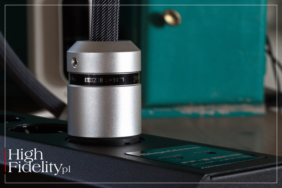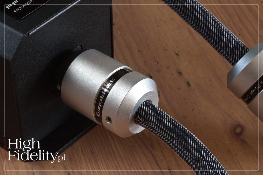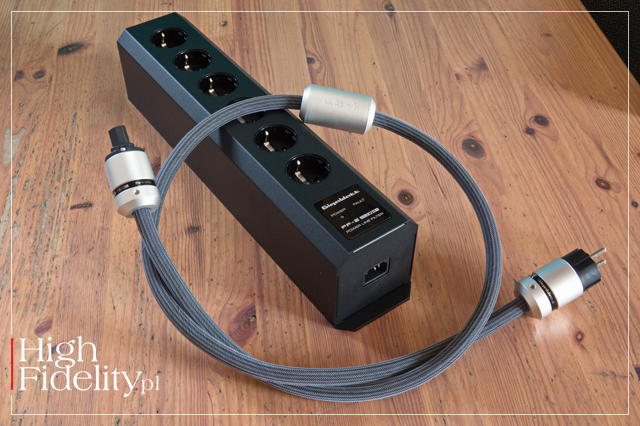 Wraz z listwą otrzymujemy kabel zasilający AC. Do wyboru mamy dwa modele – podstawowy Powersync Ultra (test → TUTAJ), wydamy wówczas za komplet 2650 euro, lub model LS-1 EVO+, który podbije kwotę do 3550 euro. Tę wersję testujemy. LS-1 EVO+ jest zmodyfikowaną wersją kabla zasilającego pochodzącego z referencyjnej serii kabli „LS” tego producenta. Zbudowany jest on ze skrętki siedmiu cieńszych przewodników z posrebrzanej miedzi beztlenowej o czystości 5N, produkowanej według specyfikacji Gigawatta. Jak zaznacza producent, w konstrukcji tego kabla duża waga została przyłożona do redukcji drgań wytwarzanych przez pole elektromagnetyczne indukowane wokół przewodników. Żyły robocze otacza więc „wielowarstwowy materiał, tłumiący niepożądane wibracje”. Z zewnątrz kabel dodatkowo chroniony jest czarnym, tekstylnym płaszczem z włókien poliolefinowych oraz siatką antystatyczną, która „nie dopuszcza do kumulacji ładunków elektrostatycznych”.