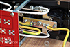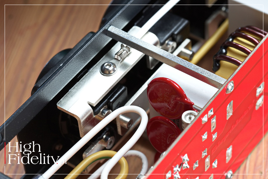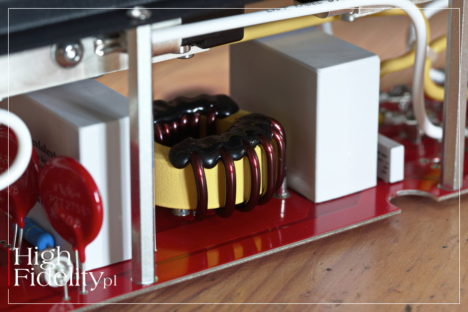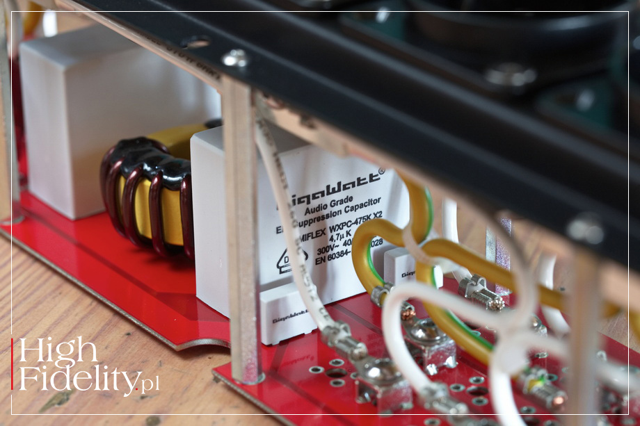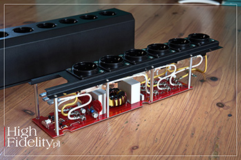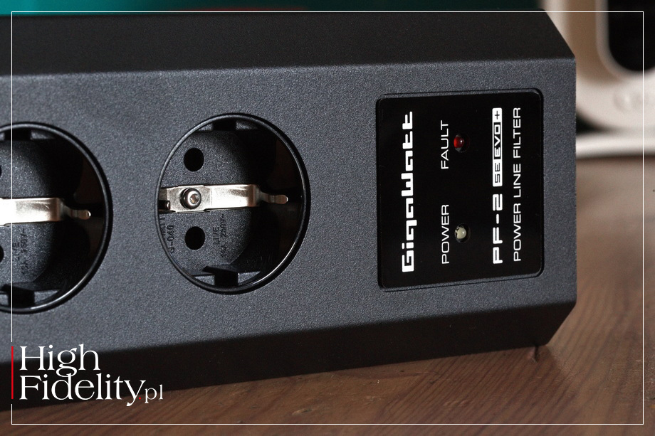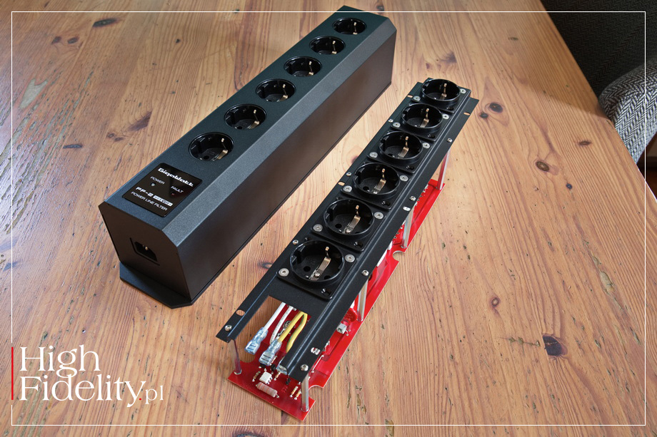 Listwa ma postać podłużnego prostopadłościanu z gniazdami zamontowanymi na jego górnej ściance. Znajdziemy tam sześć gniazd własnej produkcji, Gigawatt G-040 typu Schuko. Są one połączone w pary miedzianymi, również grubo srebrzonymi, szynami. Polski producent zaprojektował zarówno gniazda jak i okablowanie – są one produkowane przez poddostawców wyłącznie dla niego. Własnego pomysłu jest również gniazdo IEC. Styki gniazd wykonano z mosiądzu, który został fabrycznie poddany procesowi srebrzenia technicznego. Jak podkreśla producent, proces ten odbywa się bez udziału metali pośrednich, takich jak miedź czy nikiel. Tego typu substraty eliminuje się, ponieważ wprowadzają niekorzystną rezystancję szeregową, a przez to spadek napięcia. Mimo że jest on niewielki, to przy precyzyjnych systemach audio jest to słyszalne. Odpowiednio duża powierzchnia styków i pokrycie ich srebrem mają zapewniać pewny kontakt z bolcami wtyków. Podobnie jak większość wysokiej klasy gniazd również i te zostały poddane obróbce kriogenicznej oraz procesowi demagnetyzowania. Napięcie do nich doprowadzane jest przez szyny o sporym przekroju wykonane z polerowanych sztab z miedzi katodowej (Cu-ETP) o – jak zapewnia producent – „wysokiej czystości”. Dodajmy, że gniazda G-040 zostały wyposażone w zintegrowane przesłony przeciwporażeniowe, które mają zapobiec wetknięciu do gniazda metalowego przedmiotu (lub ołówka – grafit również jest przewodnikiem prądu elektrycznego). Gniazda zamontowano na stalowej ramie, a tę, za pomocą długich metalowych dystansów, połączono z płytką drukowaną. Dystrybucja napięcia zapewniana jest przez kable Gigawatta o nazwie Powerlink o przekroju ø 4 mm, mocowane do gniazd i do płytki przez zaciski śrubowe. Zastosowana topologia połączeń w gwiazdę oraz wysoka przewodność i masywny przekrój poprzeczny rzędu ø 30 mm każdej z szyn mają przekładać się – jak mówią materiały firmowe – na równomierny i stabilny rozkład mocy niezależnie od obciążenia poszczególnych wyjść listwy. Zmiany w stosunku do wcześniejszych wersji widać właśnie w takich szczegółach. Przypomnijmy, że wersja PF-2 Evo+ od PF-2 Evo różniła się tym, że we wszystkich połączeniach kablowych wykorzystano niemagnetyczne śruby. To, wydawałaby się, niewielka zmiana, ale producent uznał, że wraz z przeprojektowaną płytką PCB uzasadnia ona dodanie do nazwy „plusa”. Ta zmiana pozostała również w wersji SE. Jak mówił wcześniej Adam, powiększono pojemność kondensatorów, a przez to musiała się nieco zmienić budowa wewnętrzna. Przypomnijmy, że te elementy są wykonywane na zamówienie i we współpracy z innym polskim specjalistą, firmą Miflex.