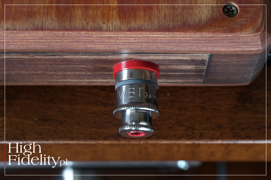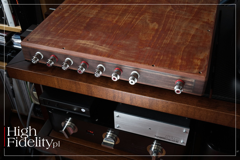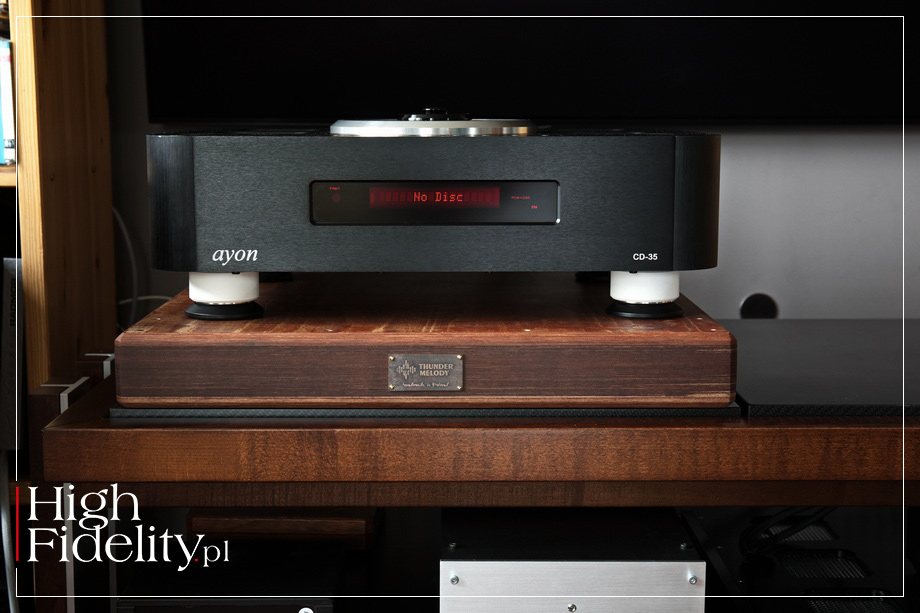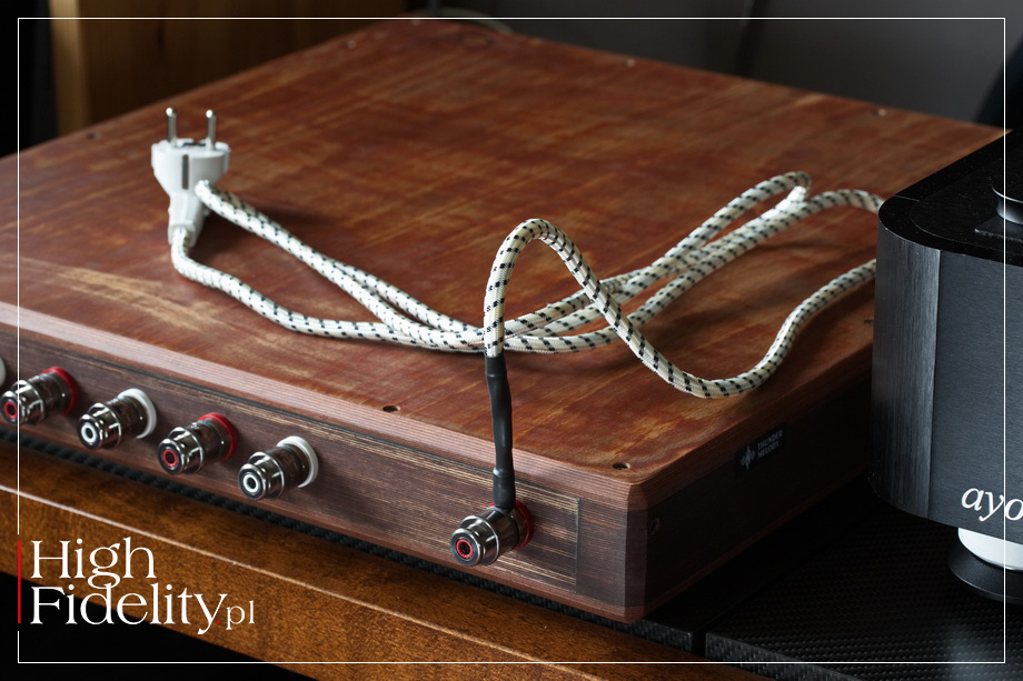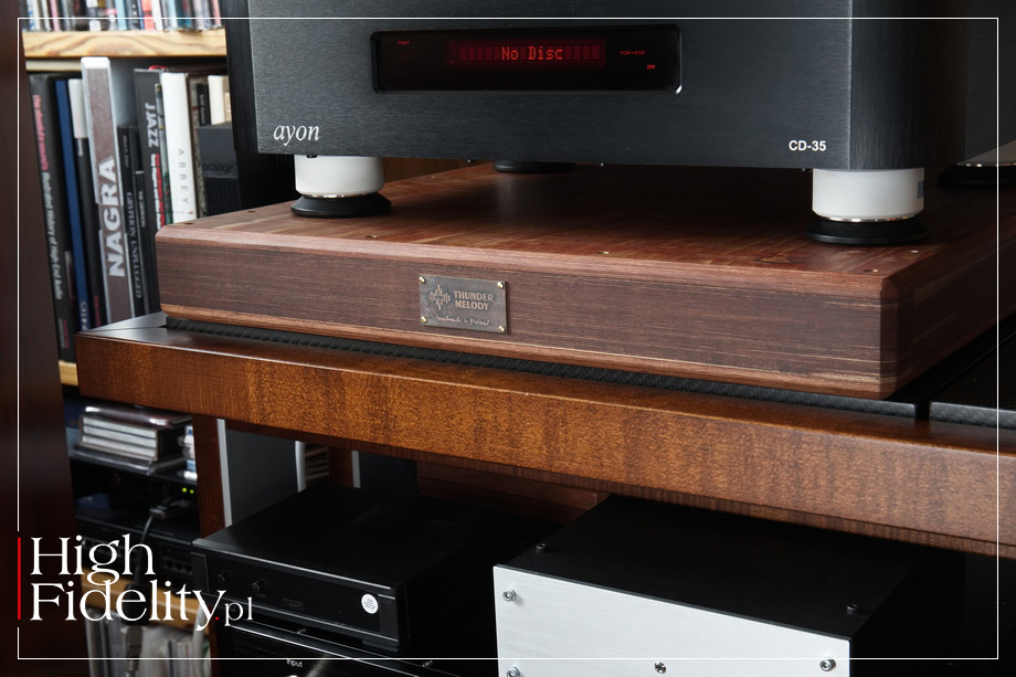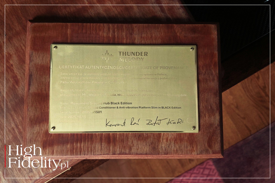 | ˻ PREMIERA ˼ ⌈ THUNDER MELODY jest polską marką audio, powstałą w 2020 roku. Założona została przez panów KONRADA RASIA i RAFAŁA HŁADZIAKA i specjalizuje się w produktach służących do tłumienia drgań, redukcji szumów i kondycjonowania napięcia zasilającego. Testujemy jej produkt będący połączeniem platformy antywibracyjnej oraz sztucznej masy, w wersji Black, czyli najwyższej. To jego PREMIERA. ⌋ MÓJ PIERWSZY KONTAKT Z FIRMĄ Thunder Melody miał miejsce przy okazji testu platformy antywibracyjnej Monument, niemal dokładnie pięć lat temu; test → TUTAJ. Firma właśnie powstała, była kompletnie nieznana, nawet strony internetowej jeszcze nie miała – co się zresztą nie zmieni przez kilka kolejnych lat – a już proponowała produkt bardzo drogi, a przy tym zaawansowany mechanicznie. I w tym segmencie rynku już pozostała.   Dzisiaj jest okrzepłym producentem, oferującym zarówno osobne elementy, jak i kompletne systemy, w tym customowe, projektowane pod kątem konkretnego systemu i odbiorcy. Ma również kompletne portfolio, w którym łączy zarówno swoją wiedzę na temat redukcji drgań jak i minimalizowania szumów. I to te drugie wydają się w jej podejściu do audio najważniejsze w tym sensie, że zarówno kluczowe do osiągnięcia wysokiej klasy dźwięku, jak i najtrudniejsze do eliminacji w sposób, który dawałby założone rezultaty. A to dlatego, że chodzi zarówno o szum mechaniczny, jak i elektryczny. Najnowsza propozycja Thunder Melody, Ground Hub Black Edition, łączy te dwa podejścia, oferując w jednej obudowie zarówno platformę antywibracyjną, jak i sztuczną masę. ▲ Kilka prostych słów KONRAD RAŚ, RAFAŁ HŁADZIAK   Sztuczna masa (kondycjoner masy) to kolejny z komponentów w ofercie Thunder Melody. Jest on de facto centralnym urządzeniem w całej naszej architekturze urządzeń odszumiających i kondycjonujących do urządzeń audio. Inne nasze urządzenia, jak platforma antywibracyjna (Monument), akceleratory prądowe (nanoGrall), sygnałowe (accXLR, accRCA), kondycjonery zasilania (GRAAL), generatory (LFG) jak i okablowanie np. kable głośnikowe ATTO Speaker, posiadają wyjście do uziomu zewnętrznego. W przypadku, gdy ktoś posiada pojedyncze elementy, można je uziemiać osobno, jednakże w przypadku szerszej architektury uziomowej, warto rozważyć scentralizowanie systemu uziemiającego, korzystając z efektów synergii odszumienia każdego z jej składowych elementów. To samo dotyczy wyprowadzeń uziemienia wzmacniaczy, streamerów, kompaktów i innych urządzeń, o ile mają takie możliwości podłączenia. Jak widać, ilość komponentów do podłączenia może być bardzo różna i dlatego potrzebne jest zeskalowanie takich kondycjonerów masy. Najmniejszy Ground Hub w wersji Silver może mieć 3-4 porty wejściowe oraz 1 wyjściowy i być rozmiarów zeszytu B5, ale też może być wielkości urządzenia audio i stanowić dla niego także platformę antywibracyjną, a skończywszy na półce stolika audio o szerokości 110-140 cm - wszystkie wymienione w wersjach Silver z opcjami apgrejdu do Black.   Do recenzji przedstawiamy właśnie rozwiązanie w skalowaniu pośrednim (czyli platforma ze sztuczną masą), w topowym wyposażeniu Black - z 7 portami wejściowymi i jednym wyjściowym. Nie jest to największe rozmiarowo rozwiązanie, ale z maksymalnie wykorzystanymi wejściami. Sama platforma jest wersją Monument Black o szerokości 50 cm, głębokości 50 cm i wysokości 6 cm (wersja Slim) i wadze ok. 18 kg. Jest ona aktualną wersją na rok 2025, jeszcze bardziej zaawansowaną względem Monumentu z roku premiery w roku 2020. W przedstawionej wersji platformy jest zamontowanych siedem modułów kondycjonujących na wtykach głośnikowych WBT Ag. Zalecamy podłączenie po jednym urządzeniu na port, aby otrzymać najlepsze rezultaty, jednakże można także wykorzystać możliwość podłączenia i jako wejście bananowe razem z wejściem widłowym. Tyle tylko, że nie uzyskamy wówczas separacji mas w układzie innym niż zalecany. Złożoność możliwości konfiguracji jest odzwierciedlona w składowych końcowej ceny. Przedłożona wersja do recenzji składa się z: 1. Monument Black (2025) – 1 x 45 000 zł. Koszty każdorazowo są kalkulowane w oparciu o potrzeby uzgodnione z klientem. » TM ▌ Ground Hub Black Edition GROUND HUB BLACK EDITION to dwa produkty w jednym. Jak mówił pan Raś, chodziło o to, aby zmniejszyć ilość komponentów w systemie, a jednocześnie nie stracić zalet stosowania oddzielnych produktów, osobno do redukcji drgań i szumów. Platforma (tak będę o niej, skrótowo, mówił) wygląda bardzo ładnie, w czym widać duży postęp w stosunku do pierwszego Monumentu. Ma ona spore rozmiary w płaszczyźnie poziomej, bo mierzy 50 x 50 cm, ale jest znacznie niższa niż pierwowzór, bo to tylko 6 cm. To ważne, ponieważ w wielu systemach wysokość półek stolików audio nie pozwala na stosowanie wysokich elementów pod urządzeniami. Przy okazji lepiej też to wygląda. Pan Hładziak, który jest odpowiedzialny za produkcję, mówi że udało się to dzięki pozyskaniu materiału od innego producenta, o podobnych parametrach, a o mniejszej grubości. Obudowa jest wykonana ze sklejki „pancernej” (niem. Panzerholz). To odmiana sklejki o właściwościach antywibracyjnych, w wersji suchej, która jest produkowana dla tej marki na, jak mówią jej twórcy, „ściśle określone zamówienie”. To materiał specjalistyczny, dlatego firma otrzymuje go ok. 3-4 miesiące od zamówienia. Materiał jest sezonowany zaraz po produkcji oraz po wykonaniu, tak żeby zachowywać jego właściwości przez długie lata. Jak się dowiedziałem, to jeden z najszybciej drożejących elementów składowych produktów tej firmy – w ostatnim czasie podrożał o ponad 100%, czyli więcej niż złoto.   Z zewnątrz platforma jest wykańczana woskiem. Z przodu mocowana jes