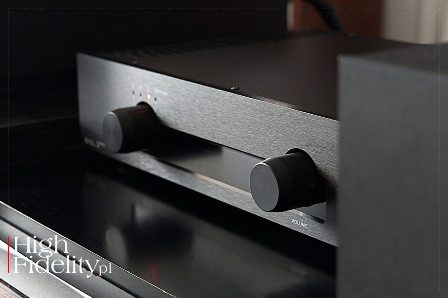 Wszystko to stanowi o wyjątkowości testowanego wzmacniacza. Z jednej strony dysponuje całkiem sporą mocą i potrafi z niej korzystać, słowem zachowuje się jak rasowy tranzystor. Z drugiej jednakże, to współczesny tranzystor, taki, w którym muzykalność, płynność, naturalna gładkość są równie ważne. I owszem, dziś, co było trudne do przewidzenia piętnaście, a może nawet tylko dziesięć lat temu, większość wzmacniaczy solid-state gra w ten sposób. Rzecz w tym, że ich twórcy nie skupiają się już wyłącznie na detaliczności, precyzji, transparentności, zimnej neutralności, potędze i dynamice brzmienia, ale łączą je z wypełnieniem, gładkością i płynnością, a ową zimną neutralność zastąpiła (tak naprawdę ciepła, gęsta) naturalność. I choć Sol 2 Pro kosztuje niewiele, to i on, podobnie jak wzmacniacze za dziesiątki i setki tysięcy, oferuje taki właśnie charakter brzmienia. ▌ Podsumowanie OK., TO NIE JEST TAK ROZDZIELCZY DŹWIĘK jak z wzmacniaczami odniesienia (o jeszcze dużo droższych nawet nie wspominam). Nie jest aż tak nasycony, tak gęsty, nie różnicuje też nagrań aż tak dobrze i nie dorównuje im do końca w zakresie oddawania kontrastów dynamicznych i tonalnych zwłaszcza na poziomie mikro. Słowem, nie jest to granie równie wyrafinowane jak z dużo droższymi wzmacniaczami. Tylko że, po pierwsze, jakoś nie miało to właściwie żadnego znaczenia dla przyjemności słuchania, a po drugie, powtórzę raz jeszcze, różnice nie były tak duże, jak można się było spodziewać. Ujmując rzecz jeszcze inaczej: oprócz naprawdę dobrego grania, stosunek jakości do ceny Sol 2 Pro ma znakomity! Osiągnięcie tego z lampami w tej cenie raczej nie byłoby możliwe, bo one wymagają drogich transformatorów, dławików, itd.. Zmieścić się w takim budżecie i osiągnąć porównywalną klasę brzmienia byłoby bardzo trudno. Ta integra dowodzi jednakowoż, że można się bez lamp obejść, a i tak brzmienie jest naturalne i przyjazne dla ucha, wokale brzmią prawdziwie, podobnie jak instrumenty akustyczne, a i przestrzenność tego grania jest zadowalająca. A przy tym wszystkim dostajemy też „kopa”, skalę, rozmach, energię i świetny PRAT, dzięki którym posłuchamy i jazzowego tria i zespołu rockowego i orkiestry symfonicznej z równym zaangażowaniem i przyjemnością. Sol, jak zdaje się sugerować nazwa, potrafi rozświetlić nawet ponury, jesienny dzień na długie godziny, czy to będziecie go słuchać w tle codziennych czynności, czy całkowicie skupicie się na muzyce (co z Haiku jest naprawdę łatwe), a na dodatek będzie wam dawać może nawet podwójną frajdę. Wyobrażam sobie bowiem, że jego posiadacze będą mieć uśmiech na twarzy nie tylko z powodu dźwięku, ale i świadomości, że mają go za niecałą „dziesiątkę”. Dobre i polskie! Zasłużony ˻ RED FINGERPRINT˺! ▌ BUDOWA SOL 2 PRO TO OPARTY O TRANZYSTORY wzmacniacz zintegrowany. Jego gabaryty ani waga nie robią wielkiego wrażenia (odpowiednio 450 x 350 x 100 mm i 12 kg), ale moc już i owszem, jako że przy 8 Ω potrafi oddać nawet 105 W, a przy 4 Ω – 180 W. Producent nie podaje dokładnie jak wygląda rozkład, ale pierwsze waty dostajemy w klasie A, kolejne w AB. Urządzenie umieszczono w dość skromnie się prezentującej, ale porządnie wykonanej i wykończonej czarnej metalowej obudowie ustawionej na czterech nóżkach. Na froncie umieszczono dwa spore pokrętła: selektor wejść i regulację głośności. Towarzyszy im jedna skromna czerwona dioda sygnalizująca pracę urządzenia. Boki obudowy to solidne radiatory skutecznie odprowadzające nadmiar ciepła. Na tylnej ściance obok gniazda zasilającego w standardzie IEC umieszczono włącznik urządzenia. Dalej znajdziecie trzy pary pozłacanych gniazd RCA, a nad nimi jedną parę XLR – wszystko to wejścia liniowe. Zestaw gniazd uzupełniają solidne, pojedyncze, pozłacane gniazda głośnikowe. Dodatkowym elementem wyposażenia jest pilot zdalnego sterowania. Jak już mogliście Państwo przeczytać wcześniej, Sol 2 Pro jest kontynuacją linii Sol. Jego schemat oparty jest na identycznej topologii trzech stopni wzmocnienia bez sprzężenia zwrotnego. Pierwsze dwa stopnie wzmacniacza pracują w klasie A Single Ended, ale sercem wzmacniacza jest drugi stopień pracujący na pojedynczym tranzystorze FET o wysokim prądzie spoczynkowym, który bezpośrednio steruje komplementarną parą bipolarną tranzystorów stopnia mocy. Podobnie jak w modelu Sol II, w testowanej wersji zastosowano tranzystory mocy Toshiba. Użyto ich jednakże dwa razy więcej i stąd moc wyjściowa wzrosła dwukrotnie.