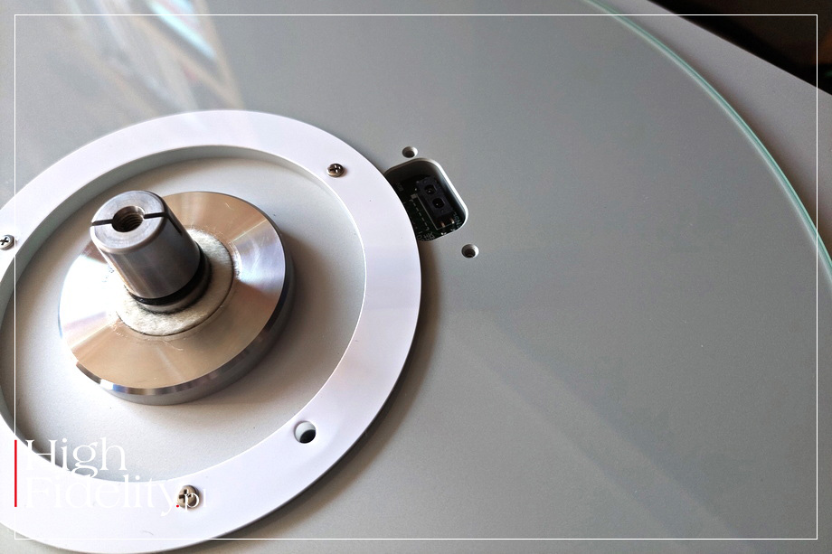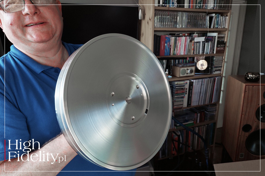 W połączeniu z naszym systemem łożysk powietrznych, talerz o wadze 9 kg zapewnia wyjątkowo niski poziom szumów. Jego stożkowy trzpień amortyzuje kołysania płyty LP z niecentrycznym środkiem. Na talerzu umieszczono specjalną cienką podkładkę wykonaną z materiału tłumiącego i antystatycznego, która chroni płyty.