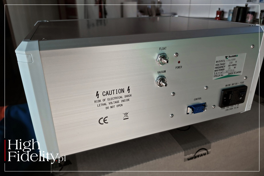 ‖ Zdjęcie tylnej ścianki pompy i zasilacza w jednym. Historycznie system ten jest znany z gramofonów firm SOTA (USA), Continuum Caliburn (USA), Walker Audio (USA), Rockport Technologies (USA), Luxman (Japonia), Sony (Japonia, w modelach profesjonalnych), a współcześnie duńskiego Bergmanna, szwedzkiej firmy SAT (Swedish Analog Technologies), amerykańskiej Basis Audio i – będącego tematem tego testu – japońskiego producenta TechDAS. ● TO WSZYTKO RZECZY ZNANE z wyższych modeli, podobnie jak wygodny „pulpit sterowniczy” z przyciskami zmieniającymi obroty, włączającą przysysanie i pokazują precyzyjnie wybraną prędkość. Różnica jest jednak widoczna gołym okiem: silnik w modelu IV został przykręcony do podstawy, podczas gdy w modelu III był stawiany osobno. W testowanym gramofonie „wisi” na dwóch solidnych elementach z metalu. Jego obudowę wykonano ze stopu aluminium A5052 (duża zawartość chromu i magnezu); całość waży 4,1 kg. Producent mówi, że to 2-fazowy 4-biegunowy silnik synchroniczny prądu przemiennego, który jest oddzielony i izolowany od podstawy, podobnie jak w wyższych modelach. Pasek napędowy ma szerokość 4 mm i również on jest taki sam jak w modelach wyższej klasy. Wykonany z polerowanego włókna poliestrowego ma zapewnić „stabilną rotację” i „szybko rozpędza ciężki talerz do prędkości znamionowej”. Jak dalej czytamy, „napędzając talerz za pomocą odseparowanego silnika, osiąga wyjątkowo wysoki stosunek sygnału do szumu”. I, dodajmy, bardzo niski wow&flutter, poniżej 0,03%.