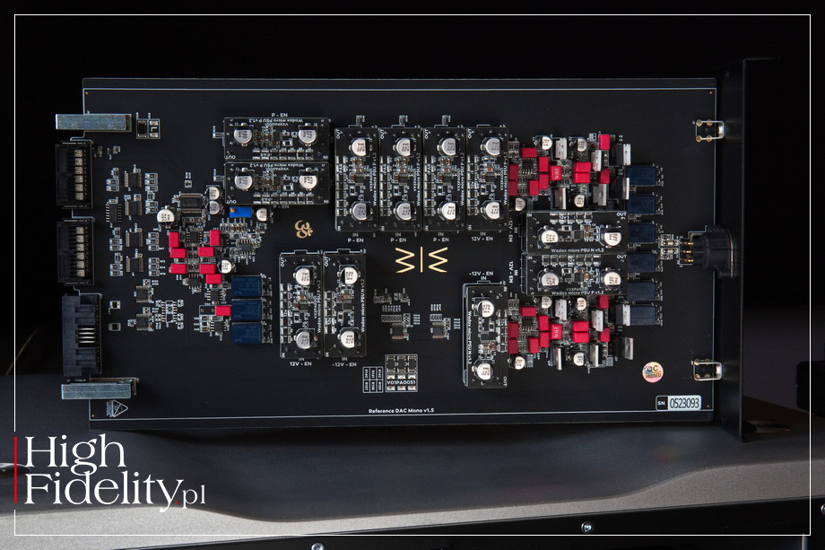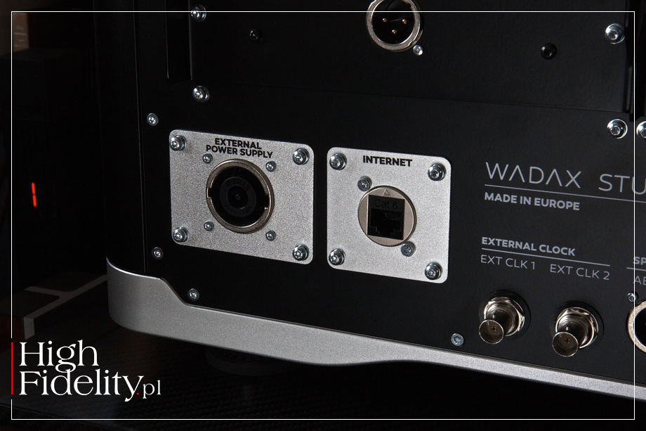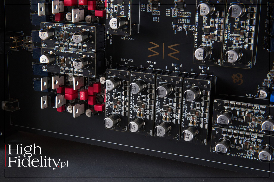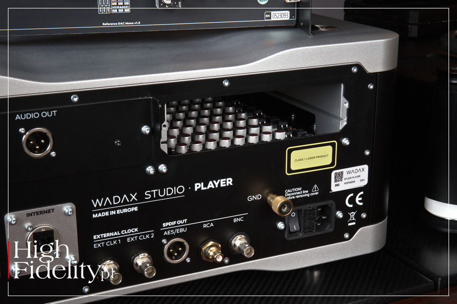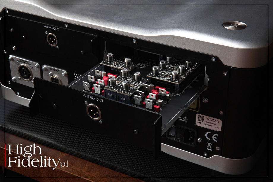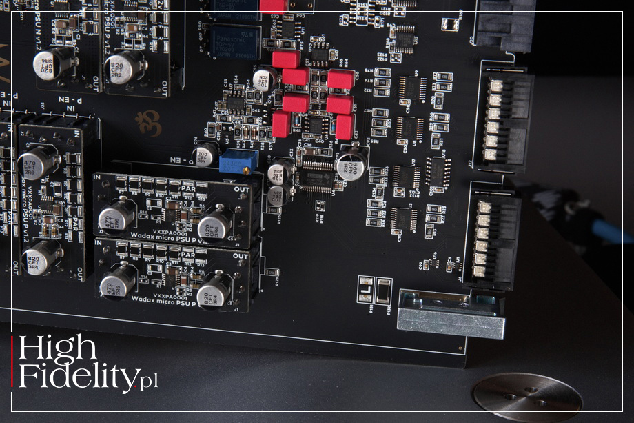 TECHNIKA • Na przedniej ściance jest więc tylko wyświetlacz dotykowy oraz wystająca poza obrys maskownica szuflady na płyty. Ta pracuje przy wysuwaniu cicho, jednak sam napęd nieco słychać podczas pracy. Wiemy też, że to nie jest ta sama jednostka, co w transporcie Atlantis. Tam mechanika została zbudowana od podstaw i odtwarza też płyty Pure Audio Blu-Ray. Studio Player bazuje na innym mechanizmie, niemodyfikowanym. Wygląda na to, że jest to transport austriackiej firmy SUOS (StreamUnlimited) PL-2800 SilverStrike. Jego tacka jest wykonana z kompozytu aluminium i ABS, a po bokach umieszczono pręty stalowe, które są prowadzone w łożyskach z – jak zapewnia producent – „wysokiej jakości” tworzywa POM. To przypuszczenie, ale zasadne: także moduł odtwarzacza plików pochodzi z firmy StreamUnlimited. Firma ta zaopatruje dużą część rynku audio, a jej moduły znajdziemy w wielu topowych urządzeniach. Wadax odtwarza pliki z serwisów streamingowych Spotify, Tidal i Qobuz Connect, jest certyfikowany przez Audirvanę, MQA oraz Roona, może też odtwarzać pliki z lokalnej biblioteki w protokole DLNA/UPnP. Sygnał dostarczamy i otrzymujemy przez gniazda na tylnej ściance. Nietypowo, wbrew trendom, odtwarzacz nie ma wejść cyfrowych audio. Producent zdaje się w ten sposób mówić, że mamy w nim wszystko, czego potrzebujemy w cyfrowym świecie. Są za to wyjścia cyfrowe – RCA, BNC oraz AES/EBU. Jest oczywiście wejście ethernetowe (RJ45) dla plików i wyjścia analogowe. Te zamontowano w odkręcanych płytkach i są to tylko wyjścia zbalansowane XLR. To część modułowej budowy urządzenia i coś, co łączy go z referencyjną serią Wadaxa. Do slotów wsuwane są płytki z przetwornika D/A Atlantis Reference, które można będzie w przyszłości wymienić na lepszą wersję (kiedy i jeśli powstanie). Płytka została obsadzona głównie małymi modułami (płytkami na pinach) z układami stabilizacji napięcia, noszącymi nazwę Wadac Micro PSU. W przetwarzaniu sygnału cyfrowego na analogowy działają układy Burr-Brown PCM1792. To układ pochodzący jeszcze z 2006 roku, od dawna nieprodukowany, ale uważany za „klasyczny”. Akceptuje on sygnał PCM do 24 bitów, 192 kHz i DSDS. W konfiguracji mono, jak tutaj, górna częstotliwość próbkowania się podwaja. Układ te jest ceniony przede wszystkim za bardzo dobre filtry cyfrowe. Dodajmy, że na wyjściu układu pracują tranzystory, a nie układy scalone. Na tylnej ściance, mamy też gniazda dla dwóch pozostałych produktów z serii Studio: zegara taktującego Studio Clock oraz zasilacza Studio PSU; do kompletu jest też specjalny kabel Akasa DC Studio, którym połączymy Player i PSU. Od strony układowej to urządzenie o budowie dual-mono z całkowitym fizycznym i elektrycznym oddzieleniem lewego i prawego kanału (cyfrowego i analogowego). Sygnał przez cały czas jest prowadzony w formie zbalansowanej. W jego centrum pracuje, wspomniany, układ korygujący błędy, tutaj w wersji musIC 3. Układy sekcji cyfrowej mają być zsynchronizowane czasowo do 100 ps, a całkowity szum wyjściowy ma być mniejszy niż 0,5 μV (1 Hz–100 kHz). Wadax informuje, że w zasilaczu zastosowano trzydzieści lokalnych stopni regulacji i pięć stopni regulacji prądu stałego. Player daje możliwość korekty dwóch parametrów elektrycznych. Użytkownik w menu może zmienić maksymalne napięcie wyjściowe (1, 2 i 4 V) i impedancję wyjściową. W instrukcji obsługi czytamy:
