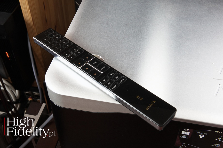 I jeszcze jedno – odtwarzacz jest dostarczany w dużej, solidnej skrzyni transportowej z kółeczkami. Fajne. PILOT • Odtwarzaczem sterujemy za pomocą ekranu dotykowego lub pilota zdalnego sterowania, Ten jest ładny z akrylowymi guzikami o wyraźnym punkcie zadziałania. Nie jest jakoś superegonomiczny, ale jest OK. Ciekawe, ale nie jest to pilot kupiony i jednego z wyspecjalizowanych dostawców z Chin. Produkuje je austriacka, założona w 1969 roku, firma Ruwido i to niemal dzieło sztuki. Na jej stronach internetowych czytamy: