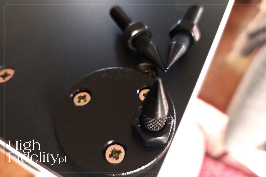 Kolumny stanęły na firmowych kolcach, pod które podłożyłem podkładki Acoustic Revive SPU-8; w komplecie nie ma podkładek. W przyszłości warto by było wymienić kolce na nóżki antywibracyjne, na przykład Pro Audio Bono lub podobne. Przednie ścianki znalazły się w odległości 245 cm od miejsca odsłuchowego i 200 cm od siebie, licząc od ich osi pionowej. Od tylnej ściany znajdowały się w odległości 85 cm, również od ich osi i górnej krawędzi. Kolumny skręcone były bezpośrednio na miejsce odsłuchowe.