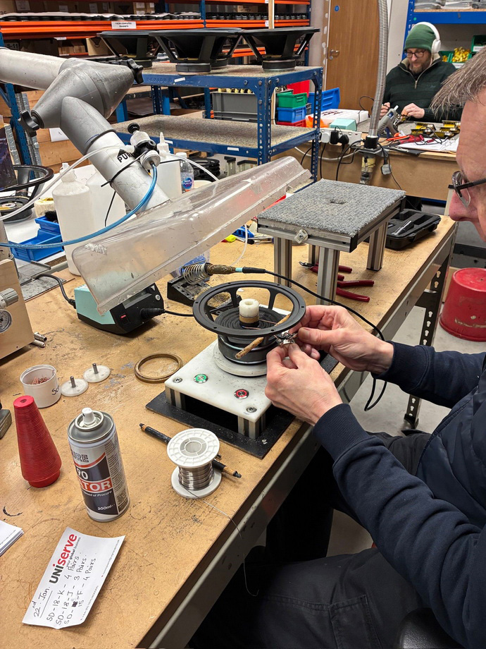 ‖ Stanowisko na którym są budowane przetworniki nisko-średniotonowe A4.2 • zdj. Spendor Kluczowe zmiany obejmują całkowicie nową konstrukcję zwrotnicy, zoptymalizowaną pod kątem pracy kolumny poza główną osią i płynniejszej integracji przetworników. Zapewnia to bardziej otwarty i dokładniejszy obraz stereo, pozostając jednocześnie „przyjaznym” dla akustyki pomieszczenia. Większy, lepszy głośnik wysokotonowy pozwala na obniżenie punktu zwrotnicy przy niższych zniekształceniach, co skutkuje słodszą i czystszą prezentacją wysokich częstotliwości.