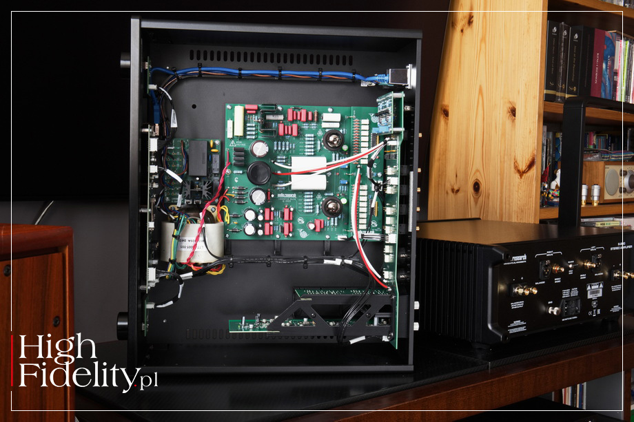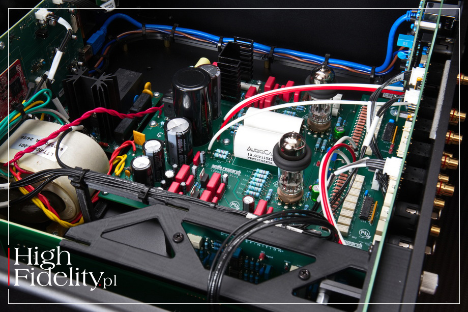 LS-2 oferuje sześć wejść liniowych, z czego dwa są wejściami zbalansowanymi XLR, a trzy niezbalansowanymi RCA. Pamiętajmy o tym, że ARC umieszcza gniazda odwrotnie – lewy kanał jest na górze, a prawy na dole. Mamy też do dyspozycji dwie pary wyjść liniowych, ponownie na XLR i RCA. LS-2 ma budowę niezbalansowaną, wejścia XLR są więc traktowane jak wejścia niezbalansowane, natomiast przed wyjściem XLR jest półprzewodnikowy symetryzator. Obok znajdziemy gniazdo USB, ale nie dla sygnału audio, a dla nowego oprogramowania sterowania, jeśli będzie dostępne. LS-2 jest lampową konstrukcją pracującą w klasie A bez sprzężenia zwrotnego; lampową, ale z zasilaczem półprzewodnikowym. I nie do końca „czysto lampową”, przynajmniej kiedy będziemy korzystali z wyjścia XLR – wówczas będziemy mówili o budowie hybrydowej. W sercu urządzenia znajdują się dwie lampy Sovtek 6H30Pi – sporej wielkości podwójne triody, które znajdziemy również, dla przykładu, w odtwarzaczach CD firmy Ancient Audio, BAT i Ayon Audio. Swego czasu mówiono o nich „superlampy” ze względu na osiągi, w tym możliwości prądowe. FUNKCJONALNOŚĆ • Choć mowa o klasycznym przedwzmacniaczu, ma on całkiem spore możliwości funkcjonalne. Możemy nim sterować za pomocą gałek na przedniej ściance, dotykowego wyświetlacza lub z pilota zdalnego sterowania. Użytkownik ma z nim łatwe życie, a to dzięki dużemu, siedmiocalowemu wyświetlaczowi LCD. Dużymi cyframi jest na nim pokazywana siłą głosu, a obok wyświetlane jest aktywne wejście. Pod spodem mamy wyświetlone nazwy przyciszenia, mute oraz mono/stereo. W lewym dolnym rogu umieszczono ikonkę menu. A tam ustalimy czy wejście ma być mono czy stereo, albo czy ma być „przelotką” dla systemu kina domowego (procesora AV). Zmienimy też jasność wyświetlacza i ustalimy jeszcze jaki ma mieć kolor; ja wybrałem klasyczny dla tego producenta zielony, ale biały też wygląda bardzo dobrze. Wyświetlacz jest dotykowy, nazwy i ikony duże. Ale mamy też dwie klasyczne gałki – jedna to regulacja siły głosu, a druga zmiana wejścia. Ta pierwsza współpracuje nie z klasycznym potencjometrem oporowym czy drabinką scaloną, a dyskretną drabinką wykonaną na precyzyjnych opornikach Dale przełączanych przekaźnikami. Dlatego przy przekręcaniu gałki wewnątrz urządzenia słychać ciche kliknięcia. Wzorem innych producentów, na myśl przychodzi mi od razu Accuphase, ale nie tylko, LS-2 umożliwia dokupienie dodatkowych „kart”: przedwzmacniacza gramofonowego MM/MC i/lub przetwornika cyfrowo-analogowego. Wsuwa się je samodzielnie w sloty na tylnej ściance, a na wyświetlaczu pojawiają się wówczas dodatkowe opcje. Wejście gramofonowe obsługuje wkładki Moving Magnet (MM) i Moving Coil (MC), oferując wzmocnienie, odpowiednio, 42 i 62 dB. Nie mamy możliwości zmiany parametrów obciążenia. DAC dodaje do tego trzy wejścia: optyczne, koaksjalne RCA oraz USB. Nie dostaniemy jednak informacji o sygnale wejściowym. Każda z kart kosztuje 5200 złotych, czyli – jak na warunki high-endu – znośnie. TECHNIKA • Nowe urządzenia firmy ARC są zbudowane mechanicznie lepiej niż poprzednie. Zamiast giętych blach teraz to są aluminiowe profile, frezy i blachy wsuwane między boczne ścianki, a całość jest lepiej spasowana. Układ elektroniczny LS-2 zmontowano na kilku płytkach drukowanych. Pośrodku jest największa, z układem wzmacniającym. W jego centrum są dwie, dobierane i parowane lampy Sovtek 6H30 typu NOS (ang. New-Old Stock) na które założono obręcze tłumiące drgania. Sprzęgnięcie ze światem zewnętrznym zapewniają duże, nawet bardzo duże, kondensatory polipropylenowe Audiocap X Firmy Reliable Capacitors. Należą one do serii PPFXS, w której zastosowano wielosekcyjny polipropylen i napyloną cyną folię. Jak mówi ich producent, „absorpcja dielektryczna jest bardzo niska, co sprawia, że są one pożądane w systemach o dużej prędkości”. W całym układzie są naprawdę ładne podzespoły bierne, z opornikami Dale, kondensatorami Vishay , Nichicon i Wima na czele. Bardzo dobrze wygląda również zasilacz z transformatorem typu R-core i baterią kondensatorów. Ciekawostka – wiele elementów mechanicznych wewnątrz, jak belki podtrzymując kable, jak klatka dla opcjonalnych kart, wydaje się wykonanych z plastiku na drukarkach 3D. ▓ S-200 WZMACNIACZ MOCY S-200 miał premierę w czerwcu 2025 roku w ramach 55th Anniversary Series, czyli serii przygotowanej z okazji 55. rocznicy wraz z modelami S-100 oraz LS-2 i LS-3. Ma on budowę tranzystorową i pracuje w klasie AB. Przez wiele lat Wiliam Johnson unikał tranzystorów, uważając ich dźwię za „okropny”. Większość jego wzmacniaczy pracowała z lampami 6550 i kT88. Z czasem to się jednak zmieniło. W wywiadzie zamieszczonym w książce Illustrated History of High-End Audio. Volume Two: Electronics mówił: