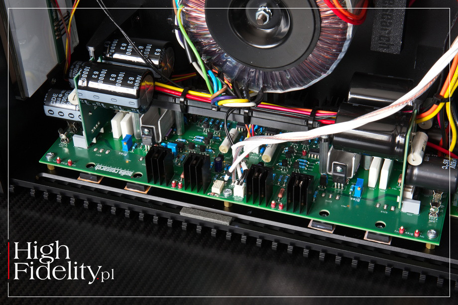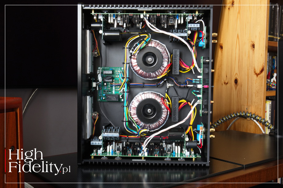 S-200 składa się, tak naprawdę, z dwóch osobnych wzmacniaczy w jednej obudowie – o takiej konfiguracji mówimy „dual-mono”. I to począwszy od zasilaczy opartych na dwóch dużych transformatorach toroidalnych, przez sekcje wejściową, sterującą i wyjściową. W tej konstrukcji producent wykorzystał tranzystory bipolarne, zamiast MOSFET-ów ze względu na – jak czytamy – ich „czystość, przejrzystość i lepszą dynamikę”. I dalej: