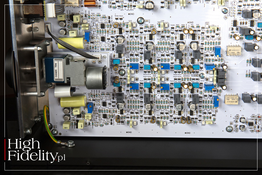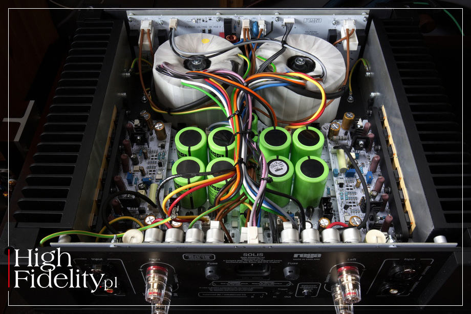 ⸜ Tamże. Sekcja D/A Mercury wykorzystuje przetworniki cyfrowo-analogowe brytyjskiej firmy Wolfson Microelectronics, z którą Rega współpracuje od lat, a które są w stanie obsłużyć sygnał PCM do 24 bitów/192 kHz oraz DSD64. Rega przyznaje, że używane przez nią kości Wolfson są starszej generacji niż obecnie używane, ale twierdzi, że zostały wybrane ze względu na ich „możliwości techniczne i dźwiękowe”. Wzmacniacz i filtr analogowy wykorzystuje tranzystory polowe typu FET firmy Linear Systems o ultraniskim poziomie szumów, a w stopniu wejściowym różnicową parę. Asynchroniczne wejście USB jest galwanicznie izolowane za pomocą własnego, dedykowanego zasilacza, ma też rozbudowany re-clocking, zarówno zegarów PCM i DSD, jak i danych odzyskiwanych z wejścia USB. Wejście USB ma dwa moduły oscylatora, zapewniające „zegary o niskim poziomie jittera zarówno dla profesjonalnych, jak i domowych częstotliwości próbkowania”. Wejście S/PDIF wykorzystuje cyfrowy odbiornik interfejsu Wolfson i pętlę PLL, która ma odzyskiwać dane o niskim poziomie jittera, a także zegary z przychodzących danych S/PDIF. Szczególną uwagę zwrócono na integralność zegara i danych zarówno w trybie PCM, jak i DSD w całym obwodzie wejściowym przetwornika cyfrowo-analogowego. Na przedniej ściance widać wyjście słuchawkowe TRS 6,3 mm. To nie jest jakiś prosty moduł, a pełnoprawny wzmacniacz słuchawkowy. Firma zapewnia, że poświęciła dużą uwagę jego integracji z resztą przedwzmacniacza. Jak mówi, wzmacniacz ten działa jak miniwzmacniacz mocy Solis, ponieważ wykorzystuje ten sam symetryczny obwód stopnia sterującego. Ma się on charakteryzować wysokim napięciem i prądem wyjściowym, dzięki czemu „wyjście słuchawkowe z łatwością obsługuje zarówno słuchawki o niskiej, jak i wysokiej impedancji”. ▓ Solis MODEL SOLIS firmy Rega jest jej referencyjnym, stereofonicznym wzmacniaczem mocy (końcówką mocy). Pracuje w klasie AB w trybie push-pull. Jak zapewnia producent, „Solis przeznaczony jest do napędzania nawet najtrudniejszych do wysterowania kolumn”. Urządzenie ma mieć bardzo niskie zniekształcenia, na poziomie 0,015% i jest wyposażone w sporo zabezpieczeń: wyłącznik termiczny, zabezpieczenie DC, mikroprocesorowy miękki-start, a także „standby” z wykrywaniem braku sygnału Solis oferuje wysoką, jak na te rozmiary, moc wyjściową wynoszącą 168 W na kanał przy obciążeniu 8 Ω i 305 W przy 4 Ω. To rzeczywiście sporo. I choć moc przy 4 omach nie jest dwukrotnie wyższa niż przy 8, to z doświadczenia wiadomo, że urządzenia tej firmy zapewniają duże prądy przy szybkich przebiegach. Czyli – nie powinniśmy się kolumn o trudnym przebiegu impedancji. Skądinąd wiadomo, że tranzystory końcowe to wysokoprądowe elementy firmy Sanken. To konfiguracja z trzema równoległymi tranzystorami multi-emitter w każdym kanale i gałęzi (w sumie to dwanaście tranzystorów) o mocy 130 W/15 A. Jak mówi producent, układ wzmacniacza jest w pełni zbalansowany i został oparty wyłącznie na tranzystorach. Ma też „rozbudowany, niskoszumny zasilacz” i jest konstrukcją „ukierunkowana na dużą rezerwę prądową oraz trwałość serwisową”. Urządzenie wyposażono w dwa rodzaje wejść liniowych, zbalansowane (XLR) i niezbalansowane (RCA), jest także wyzwalacz 12 V i niezależnie aktywowana (z przedniej ścianki) funkcja „Mute” Jak już mówiliśmy, Rega dba o rozbudowane zasilanie. W testowanym wzmacniaczu znajdziemy dwa transformatory toroidalne o mocy 330 W każdy oraz sporo kondensatorów Rega K-Power, dających pojemność 40 000 µF na kanał. Napięcie przemienne jest prostowane w szybkich diodach o – jak zapewnia firma – „niskim szumie przełączania”. Napięcie dla stopnie wejściowych jest dodatkowo stabilizowane.