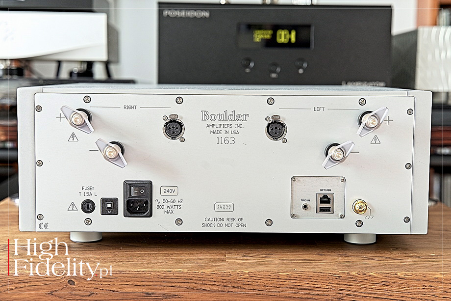 Jedynie tańsze urządzenia z serii 800, a właściwie to dopiero całkiem najtańszy przedwzmacniacz gramofonowy z serii 500, różnią się dość wyraźnie, choć i one zachowują pewne wspólne cechy z większymi i droższymi komponentami Bouldera. Sam producent podkreśla, że jest „ostatnim producentem urządzeń audio wysokiej klasy w Ameryce Północnej, który nadal samodzielnie je projektuje, opracowuje i wytwarza we własnym zakładzie”. Nowe urządzenia pojawiają się w jego ofercie niezbyt często i doskonale wpisują się w firmowe wzorce i filozofię. Gdy więc już dochodzi do prezentacji nowego modelu, to zwykle jedyną widoczną wskazówką jest wygrawerowany małymi cyferkami numer na jego froncie. W serii 1100 obecnie znaleźć można pięć urządzeń: dwa przedwzmacniacze (liniowy i gramofonowy), monobloki, a także dwie końcówki stereofoniczne. Te ostatnie odróżniają tę linię od dwóch droższych. Na „budżetowym” (dla Bouldera) poziomie producent daje bowiem potencjalnemu klientowi dwie opcje: potężną końcówkę 1162 (czyli „drobne” 61 kg wagi) zdolną dostarczyć (przy 8 Ω) moc ciągłą o wartości nawet 300 W (w szczycie 450 W), tudzież jej znacząco mniejszą siostrę, czyli testowany wzmacniacz 1163. Ta pierwsza końcówka, model 1162, zastąpiła w ofercie 1160, która miałem niegdyś przyjemność testować wraz z firmowym przedwzmacniaczem liniowym; więcej → TUTAJ. Testowany wzmacniacz, 1163, zastąpił z kolei 1161; więcej → TUTAJ. Nowe końcówki są adresowane do tych samych, czy raczej mających podobne wymagania, klientów. Ta większa (fizycznie i pod względem maksymalnej mocy) 1162 przeznaczona jest dla posiadaczy trudniejszych kolumn albo wyjątkowo dużych pokoi odsłuchowych, słowem dla tych, którzy potrzebują ogromnej mocy. Pokój mniejszy, a kolumny nieco mniej wymagające, acz realnie na to patrząc, 150 W przy 8 Ω wystarczy do napędzenia, strzelam, ale zapewne się za bardzo nie mylę, minimum 95% kolumn dostępnych na rynku w każdym normalnym pokoju, sugerują wybór mniejszej i – oczywiście – również tańszej wersji 1163. O tym, że ta druga waży skromne 25 kg zamiast 62, a i wymiary ma mniejsze, nawet nie wspominam, choć dla niektórych to również może być argument za takim wyborem. Tym bardziej, że producent zapewnia o równie bezkompromisowym podejściu do projektowania i wykonania obu (a właściwie wszystkich swoich) urządzeń. Wybór powinien więc opierać się przede wszystkim na zapotrzebowaniu na moc, które jest wypadkową „łatwości/trudności” posiadanych kolumn, wielkości (i akustyki) pokoju, plus ewentualnie indywidualnych preferencji. ▓ 1163 JAK JUŻ ZAZNACZYŁEM na początku, projekt plastyczny wzmacniaczy (i nie tylko) Bouldera właściwie nie zmienia się od wielu lat. Kolor: srebrny; „dziwne” linie na froncie – ci, którzy markę znają wiedzą, że to izohipsy, czyli linie łączące na mapie topograficznej miejsca o tej samej wysokości nad poziomem morza – odwzorowujące topografię okolic miasta Boulder, a konkretnie góry Flagstaff, fantastycznie wykonane radiatory pełniące rolę ścianek bocznych; charakterystyczne gniazda głośnikowe z wielkimi nakrętkami motylkowymi, które akceptują wyłącznie widełki; wejścia liniowe wyłącznie zbalansowane; a wykonanie i wykończenie: perfekcyjne. COŚ SZCZEGÓLNEGO • W droższych i mocniejszych modelach wzmacniaczy tej firmy charakterystyczne jest również trzydziestodwuamperowe gniazdo zasilające AC wymagające specjalnych kabli zakończonych odpowiednimi wtykami. Jednakowoż, ponieważ 1163 należy do rodziny „słabych” wzmacniaczy, czyli o „niskiej”, jak na tę markę, mocy, więc niewymagających zasilania rodem z przemysłowej spawarki, stosuje się z nim normalny kabel zasilający z wtykiem IEC. Obok niego na tylnej ściance umieszczono główny włącznik wzmacniacza, tudzież bezpiecznik. Obudowa testowanego wzmacniacza, jak to u Bouldera, jest niezwykle solidnie wykonana. Wykonano ją z grubych płatów aluminium, a całość konstrukcji pomyślano tak, by wytłumić maksimum niechcianych wibracji. Całość ustawiono na czterech antywibracyjnych nóżkach. Na froncie, oprócz wspomnianych wygrawerowanych poziomic, a także nazwy marki i modelu, umieszczono metalowy wyłącznik zasilania oraz pojedynczą diodę, która sygnalizuje jego podanie do urządzenia. Ta ostatnia, co powtarzam chyba w każdej recenzji z uporem godnym lepszej sprawy, jest (dla mnie) mocno irytująca. Otóż, gdy urządzenie jest w trybie standby, dioda powoli miga światłem białym i naprawdę intensywnym. Po włączeniu, w trakcie procedury startowej, nadal miga, ale raz na biało, raz na czerwono. W końcu, gdy urządzenie jest gotowe do pracy, dioda świeci światłem ciągłym, znowu białym i też dość intensywnym. Jeśli zakochacie się w tym wzmacniaczu, a dioda będzie was irytować równie mocno jak mnie, zwłaszcza w czasie wieczornych odsłuchów, zawszeć możecie zakleić ją kawałkiem taśmy... W ten sposób high-tech spotka się z realnym życiem. COŚ KLASYCZNEGO • Kolejna rzecz, która pozostaje niezmienna na przestrzeni lat, to bezkompromisowe podejście inżynierów Bouldera, z Jeffem Nelsonem, założycielem marki, na czele, do projektowania każdego urządzenia i bezwzględna preferencja połączeń i konstrukcji w pełni zbalansowanych. Dotyczy to nawet najtańszych serii, włącznie z przedwzmacniaczem gramofonowym 508. Słowem, przedwzmacniacz (jeśli nie będzie to propozycja Bouldera), bądź źródło z regulowanym poziomem wyjściowym, muszą dysponować wyjściami symetrycznymi, najlepiej „prawdziwymi”. Przy poprzednich recenzjach urządzeń tej firmy był to dla mnie problem. Zamieniłem więc DAC LampizatOr Pacific na model zbalansowany tej samej marki, Poseidon (gwoli jasności, nie wyłącznie pod kątem Bouldera, ale są i inne marki preferujące połączenia 