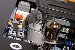 The whole circuitry of the player is mounted on one board. The drive is located in the middle, the springs that Philips uses for decoupling the drive from the support were kept. However those are not screwed to the board, as usual, but to four massive, aluminum cylinders, mounted on the bottom plate. Below the drive there is also a metal plate, that is to protect from the located centrally under the Philips drive toroidal transformer. Also on the transformer a metal plate is screwed, but such placement of it rises some concerns - in the end on the toroidal transformer axis the maximum density of the electromagnetic field is observed. Anyway, from the transformer twelve separate secondary windings are led, and we have twelve separate power supplies - for every section another one: for the drive, converter, separate for each channel in the analog section, for the tubes, for the heating, and so on. In the audio circuit we find the Cirrus Logic CS4396 converter and the Russian Sovtek 6H30 tubes. The Cirrus converter is a quite old 24/192 construction, multibit sigma-delta, from 1998, but with very good parameters, like dynamics on the level of 120dB, meaning a real resolution of 20bits. The resistors are mostly precise, metalized, and near the tubes we find small cubes of polypropylene capacitors (without a logo). The device comes packed in a tasteful wooden box, with etched, but convex, company logo and device name.