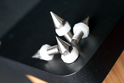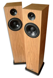 The model Stiletto 6 of the Scottish company ART Loudpeakers is a two-way, floor standing loudspeaker with a bass-reflex enclosure, venting to the back plate. The shape is very attractive, as the loudspeaker is very lean. The cross-section of the enclosure is almost square, with the front baffle narrower than the depth by 20mm. To stabilize the speaker a black varnished MDF plinth was attached. The loudspeaker is standing on four spikes with nylon, instead of metal, countering screws. The enclosure is made from plywood enforced with wooden inserts and corners and it is finished with natural veneers. Additionally the enclosure is enforced with a grommet running through the whole height of the enclosure parallel to the front baffle.