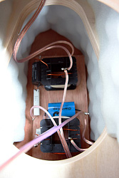 The drivers were factory modified to fit ART requirements: the tweeter in Peerless and the mid-woofer CA18RNX from the Prestige series – exactly the same like in the Penaudio Alba loudspeakers – in SEAS. The tweeter dome, with 25mm diameter, was acoustically loaded with a small tube, that has to improve efficiency and facilitate the crossing between the drivers. The woofer has a diaphragm from coated paper suspended on a rubber, quite soft, fold. The cross-over is mounted on an additional plywood plate and glued to the back plate, just behind the SEAS driver. We find there two very large air coils, wound on large carcasses, three resistors and two, brilliant British polypropylene capacitors ClarityCap from SA and PX series. Double wire terminals, solid, but without exaggeration, are located below the bass-reflex port. Upon additional payment better terminals and different veneers are available.