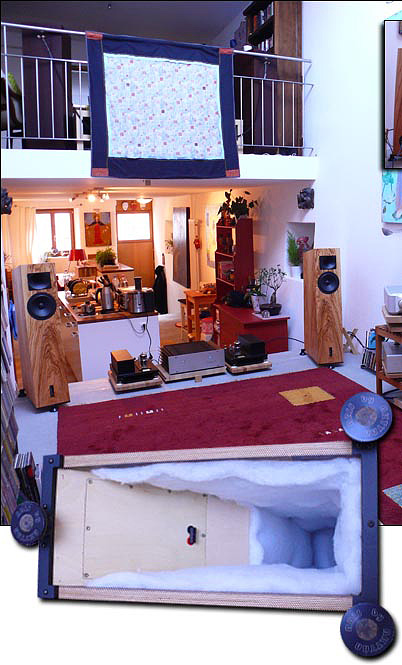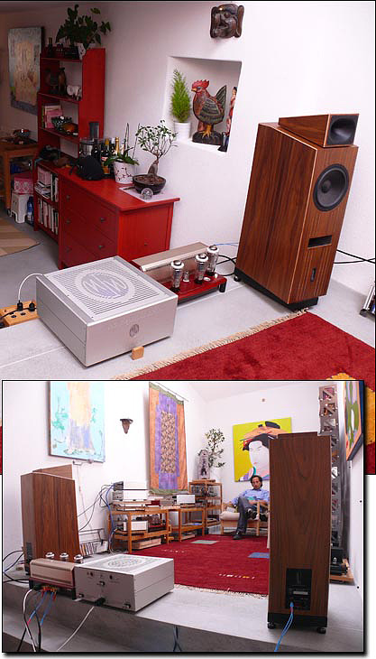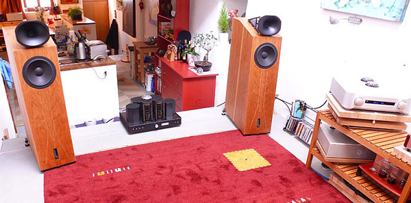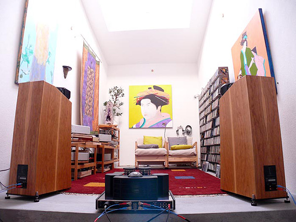 Room size: The sound platform is 3 x 4.5m with a 2-story slanted ceiling above; four steps below continue into an 8m long combined open kitchen, dining room and office, an area which widens to 5.2m with a 2.8m ceiling; the sound platform space is open to a 2nd story landing and, via spiral stair case, to a 3rd-floor studio; concrete floor, concrete and brick walls from a converted barn with no parallel walls nor perfect right angles; short-wall setup with speaker backs facing the 8-meter expanse and 2nd-story landing.