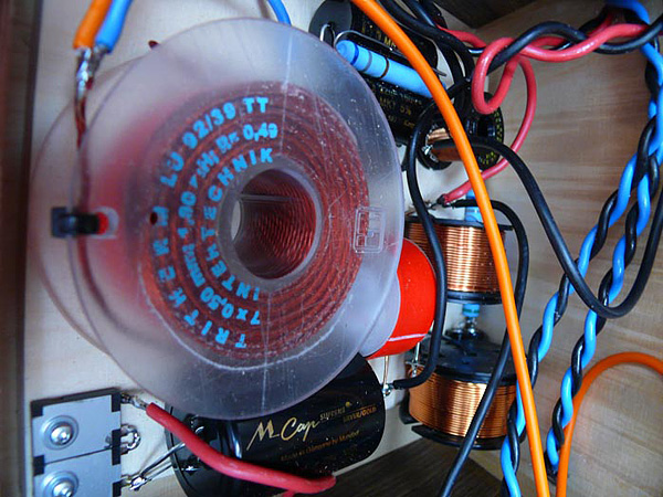 Starting at €5,000/pr, there was the new Fun 17 model. It combines a 35mm Mylar tweeter behind an oval MDF horn with a 6.5-inch mid-woofer via a 12dB electrical, 18dB acoustic network at 1.8kHz. F3 with steep rolloff below it is 40Hz, in-room sensitivity 92dB (anechoic 89dB) and approximate weight 25kg. Cabinet construction is 18mm Birch Ply, the geometry avoids parallel walls except for the sides and the internals sport a compression chamber for the woofer. Behind that chamber's carefully calculated throat opening, the internal horn line doubles back up in a flare, then turns around and fires into the floor to create the desired radiation resistance for the driver (the tweeter's in-house crafted rear chamber is sealed). All cabinet walls are heavily lined to absorb midrange frequencies above 300Hz and horn gain below that is ca. 3dB. Standard finish is Birch, a €600 surcharge adds Walnut or Cherry and €6.500 total buys Olive veneer. As for the other two models, an impedance correction network linearizes the ohmic peak at the crossover point which for valve amps would be more challenging. This correction network can be disabled by pulling the jumper in the crossover cover of the horn mouth.