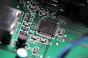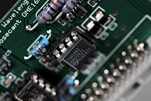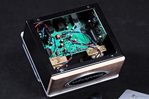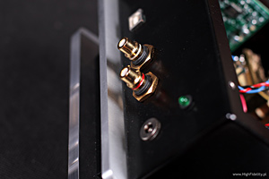 Inside we have two PCBs – the main one, with the USB controller TAS1020B and a smaller one, with the Wolfson Microelectronics WM8716 converter on it. The controller was modified by Wavelength people to work in asynchronous mode (Asynchronous Mode USB Audio). This means, that the signal is clocked not by the computer clock, but by and internal clock, mounted near the controller. This allowed to minimize jitter. There are not many elements on the PCBs, but those that are, are from very high quality: metalized resistors, Wima polypropylene capacitors, Rubycon Black Gate electrolytic capacitors. On output we have the mentioned tube, coupled to the output RCAs by means of transformers. Behind those there are also chokes.