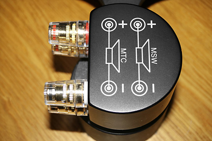 Regulacja ustawienia kolumny jest przeprowadzana jedną, umieszczoną z przodu, nóżką. Na tylnich nóżkach umieszczony wygrawerowany został napis, a zarazem logo twórcy oraz opis wyprowadzeń (zdj. 5, zdj. 6, zdj. 8). Wyprowadzenia elektryczne głośników mieszczone zostały na jednej z nóżek - jest to zawsze wewnętrzna nóżka kolumny. Wyprowadzenia elektryczne są separowane galwanicznie od siebie (nie posiadają wspólnej masy) i są podłączone bezpośrednio do głośników. Do budowy kolumn wykorzystałem dwa typy przetworników - szerokopasmowy Manger MSW W05 1.2 oraz niskotonowy Manger MTC0803-8. Głośnik szerokopasmowy umieszczony jest w centralnej części kolumny (zdj. 7), natomiast niskotonowy od spodu kolumny i zwrócony jest w kierunku podłogi. Wysokość tylnich nóżek na poziomie 5 cm od podłoża zapewnia mu poprawną pracę oraz wystarczające ciśnienie akustyczne. Ścianki kolumny mają grubość 15 mm i są tłumione od wewnętrznej strony gąbką o grubości 3 mm i więcej, w zależności od miejsca, w którym jest użyta. W kolumnie nie przewidziano maskownicy głośnika szerokopasmowego. Przewidziana jest natomiast, widoczna na zdjęciach (zdj. 1, zdj. 4), osłona zapobiegająca uszkodzeniom mechanicznym głośnika - osłonę ściąga się na czas odsłuchów. Obydwa głośniki są podłączone do wzmacniacza poprzez zewnętrzną zwrotnicę (zdj. 9).
