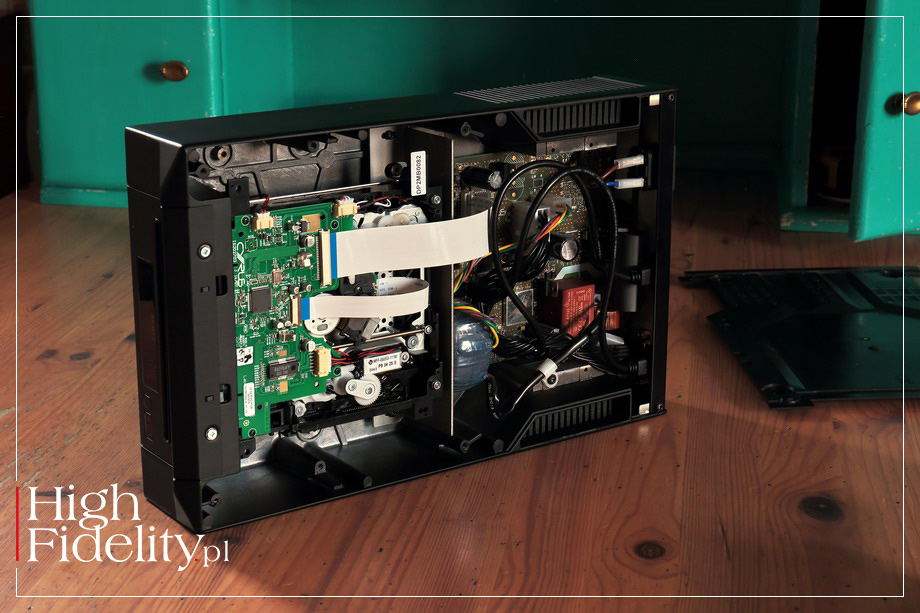 The device rests on tiny rubber feet, so you should provide this device with a good anti-vibration platform. It is also equipped with a multi-pin socket, which allows user to use an external XR series power supply - unfortunately it was not available yet during the test. MECHANICS The mechanics, with its the software, is mounted to the top of the device through an L-shaped steel plate. Its controls are placed underneath. The PCB with the logic circuit of the whole device and the power supply is placed in the second part of the chassis - there is also a small toroidal transformer there. The tested transport uses a circuit re-clocking the digital signal. So two techniques of jitter reduction were combined - at the source, i.e. in mechanics, and then at its output. We can read in the press materials that the new servo allowed manufacturer to reduce reading errors by 20%. Due to that the error correction could be shallower and less invasive. According to Cyrus, this has a big impact on the sound quality, because even when the signal sent to the DAC does not contain interpolated data, the DAC also receives noise from the source that affects the quality of the conversion. The noise level is further reduced by a new topology and a thoroughly redesigned power section and re-clocking circuit.