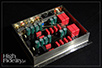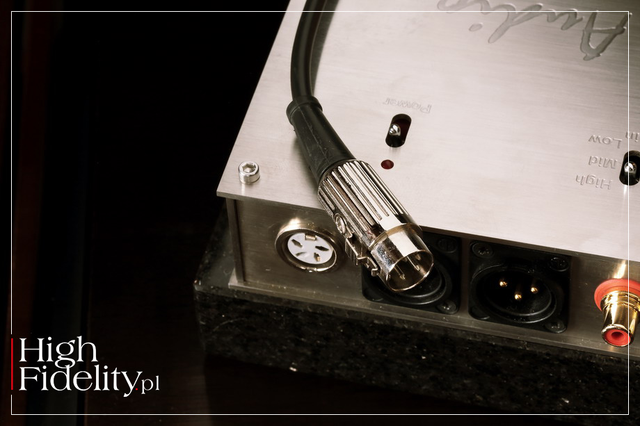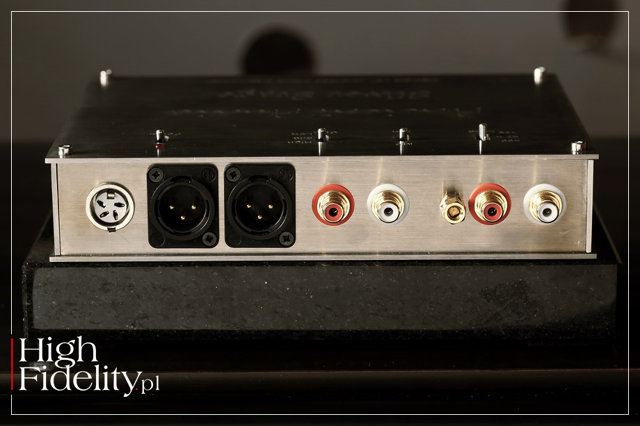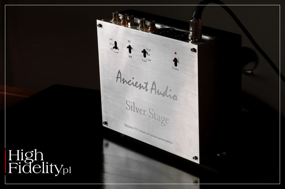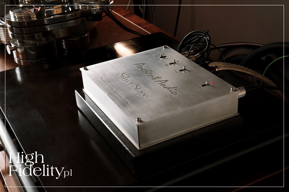 ⸜ Lektor Black turntable, developed and made for Jarek Śmietana RIAA equalization is based on RC elements. The components are also manually selected, despite the use of a precise series of WIMA capacitors. It's not about the perfect compliance with the RIAA correction curve, but the perfect matching of the left and right channels. All switches are hermetic relays. This is important because the impedance of most MC cartridges are in single figure ohms, similar to loudspeakers, so all contacts must be perfect. Hence, the wiring is similar to that used in the best Ancient Audio amplifiers - it is a high purity silver wire. Hence the name of the phonostage - Silver Stage. ♦ ▌ SILVER STAGE SILVER STAGE IS THE FIRST Ancient Audio phono preamplifier. It is also a semiconductor, transistor device, based on manually selected field effect transistors of the MOSFET type. It works with MM and MC cartridges, with active gain section for the MC ones. The input sensitivity for the MC cartridges may be set at 0.26 mV, 0.56 mV or 1 mV, and for the MM at 2 mV, 4 mV or 5 mV. I am giving the values for theses because we can change the input sensitivity with a small toggle switch on the top of the device. Importantly, not only for MC cartridges, but also for MM ones, which will also match requirements of MC HO models. The device is divided into two parts: an amplifying stage and power supply. The gain section take a form of a flat, small box bolted from non-magnetic steel panels, measuring 200 x 40 x 160 mm (W x H x D). All manipulators are accessible from its top, which is very convenient. There are four toggle switches that allow us to change (sequentially): load impedance (100Ω, 400Ω, 47kΩ), cartridge type (MM / MC) and gain (High / Mid / Low). The fourth switch is used to turn on the power, which is indicated by a red power LED. The inputs and outputs are located on the rear panel. We have a pair of RCA inputs, a pair of this type of outputs and a pair of balanced outputs with XLR sockets. As Jarek said, this is a fully balanced design. Both outputs seem to be active all the time. The output level is 0.775V (RMS) for RCA and 1.55V for XLR. And there is also a clamp for grounding, not a very convenient one, I should add.