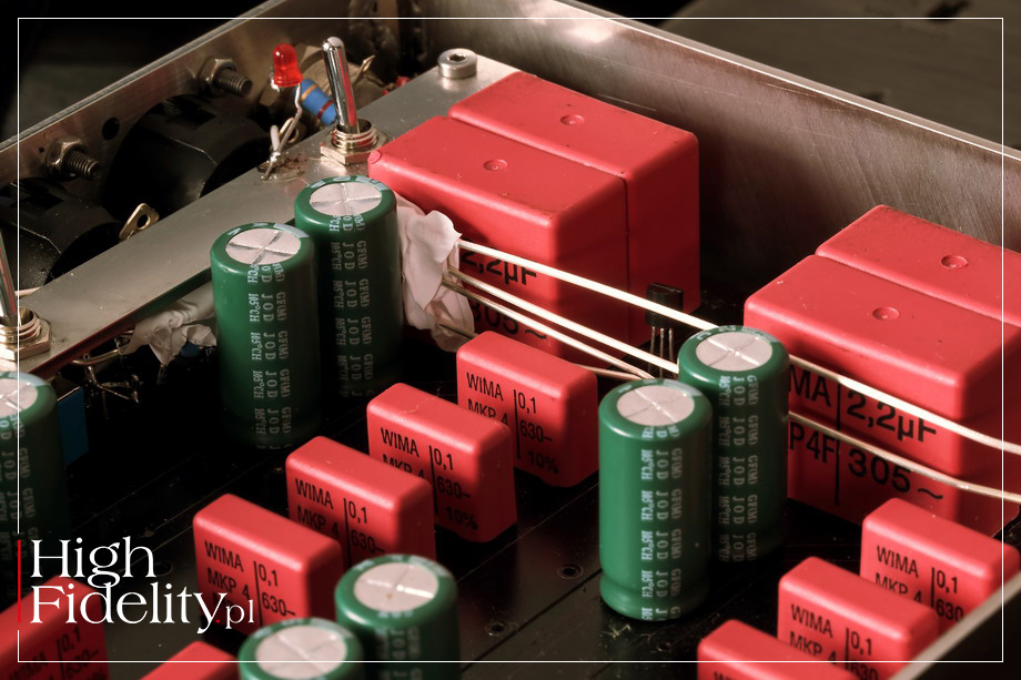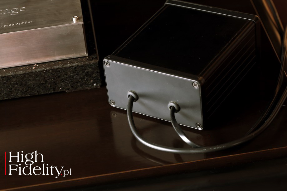 The power supply section was moved to a separate housing - it’s a simple box made of an aluminum profile. This, as the designer says, is to reduce the noise generated by the power transformer. The voltage to the amplifying section is led through a shielded cable, looking like an interconnect, terminated with a DIN plug, but in a solid, locking version. In turn, the 230V AC supply voltage is supplied with a thin, permanently installed cable that looks like it was removed from a small desk lamp. What's worse, it ends with a flat plug, not a Schuko one. |