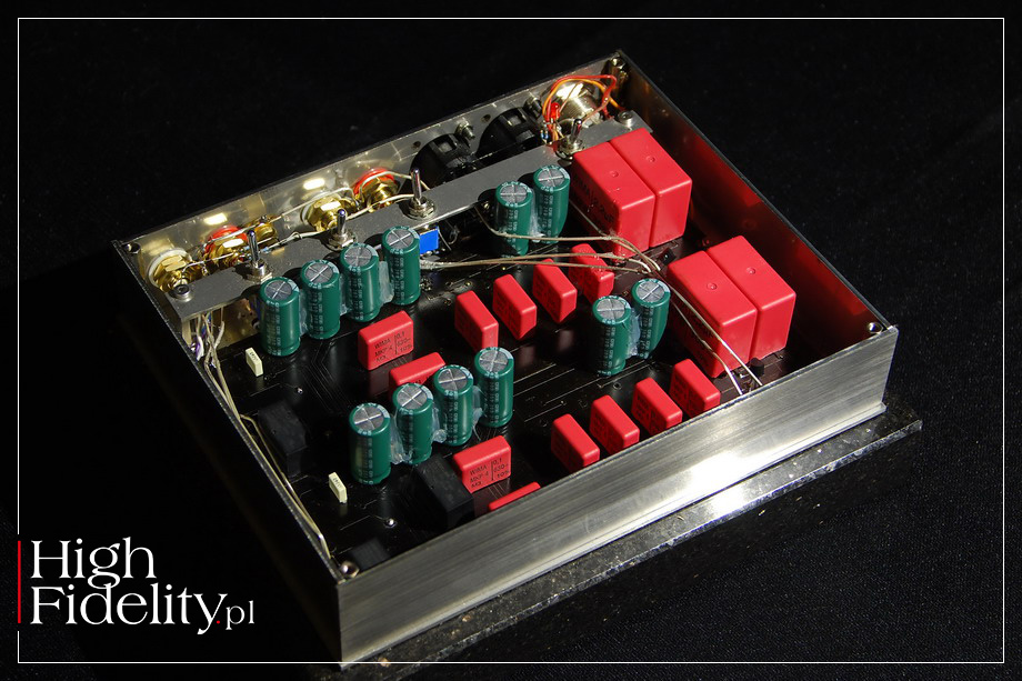 ⸜ POWER SUPPLY And the power supply has a form of a small, black box, made of a so-called "pipe", or a universal section into which a printed circuit board is inserted and closed at its ends with flat plates. Inside you can see a small power transformer, rectifiers and power supply capacitors. And now - I can not understand why the power cord is permanently attached to the power supply. And even less so, why it is one that looks like taken from a lamp terminated with a flat plug. I do not understand this approach, as Jarek repeatedly recognized the need for high quality power cables during numerous CSS meetings. ⸜ INSIDE The amplification circuit is mounted on a double-sided printed circuit board. I didn't try to remove it, and most of the active elements were hidden underneath. However, I know that there are MOSFET transistors there. From the top, nice large WIMA polypropylene capacitors are soldered to the PCB. They are selected manually so that they are as closely matched as possible to the set value. In turn, the resistors, as far as I am not deceived by my eyes, are surface soldered. The signal to the sockets is led by hand-bent pure silver wires - the same ones were used in top CD players and Ancient Audio amplifiers. Seeing them reminded me of some DIY products. ⸜ SUMMARY The Silver Phono presents a very "garage-like" style, as if it was built at the same time as the components for Jarek's turntable mentioned at the beginning. I know that there are many audiophiles who like such austerity, but for some it can be an incomprehensible extravagance. Especially that there are many good-looking devices from other manufacturers on the market. And this bloody power cable ... ■ Technical specifications (according to the manufacturer):
