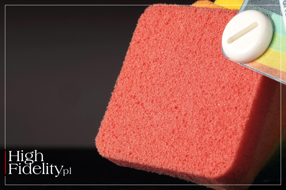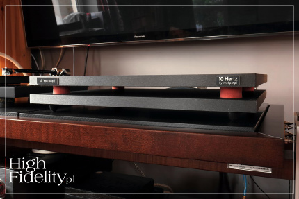 ALL YOU NEED makes you feel as if there are more sounds. Which makes sense because there are more and more of them - resolution means more information. Importantly, the platform tempers the upper midrange at the same time. I already mentioned it with Sinatra, but it also turned out beautifully with two guitar recordings, completely different ones, and yet causing similar problems for audio systems - the Friday Night in San Francisco by AL DI MEOLA, JOHN MCLAUGHLIN, PACO DELUCIA and Squint by JULIAN LAGE. Both records carry a lot of information from the midrange, especially in its upper part. The acoustic concert from San Francisco is presented with a very long reverb, largely responsible for the atmosphere of the recording. With the All You Need platform, the instruments had a lower center of gravity, but the aura in question did not disappear, they were still shown quite far away from me, they were also not weighted down. And that's good - the musicians play them in a specific way, emphasizing the attack, shortening the decay - they play them in a percussive way, a bit like a piano. It was similar with Lage's album. This musician records his electric guitar in a specific way, that is with a lot of treble. This is emphasized by the rather dry sound of the large Sound Emporium studio, where the material for the Squint album was recorded. The tested platform not only showed HOW the musicians play, but also brought me closer to them without bringing them closer to me. Me „moving towards them” was based on the fact that I heard better, heard more, which made the image of the instruments clearer. And because on the timbre axis the center of gravity shifted downwards, it was not a brightening, but me "diving" into the sound. ▌ SUMMARY PLATFORM PREPARED by Wojtek Padjas will be one of the best upgrades that you can apply to your turntable. Replacing the one you have with a higher model - sure, you can always do that. Replacing the cartridge with a better one - of course, that’s also a way to go. Replacing the interconnects with more expensive ones - undoubtedly a move in the right direction. None of these changes, however, will bring about such a comprehensive sound improvement as the All You Need platform. It is not made as well as the products of large, recognized companies, it carries the element of "garage-make" from which - metaphorically - it originates. It is problematic when it comes to balancing - for me adding additional foams piece(s) is a half-measure, not a solution to the problem. And yet - it is one of the best sound-enhancing products for budget and medium-budget turntables that I have heard for a long time. ▌ DESIGN The All You Need ANTI-VIBRATION PLATFORM is designed for non-suspended turntables weighing from 5 to 20 kg. It has a form of two boards connected at the four corners with a lossy element; the whole rests on four cone-shaped rubber feet. The tops are made of MDF boards with a vinyl veneer with a characteristic texture resembling brushed aluminum. Lossy element trimmed to form circular spacers - there are two such spacers for each corner, one on top of the other. They have an unusual pink-orange color. Two badges are affixed to the front - with the name of the platform and the name of the company; the latter in the tested copy reads: "10 Hertz by VinylSpot.pl", and the name was actually dropped by Wojtek Padjas because it was too long. All production copies will have the abbreviated name VinylSpot.pl. Nota bene, the badges are made of a material used in industry since at least the 1950s in the way they were made back then, which makes them look very intriguing.