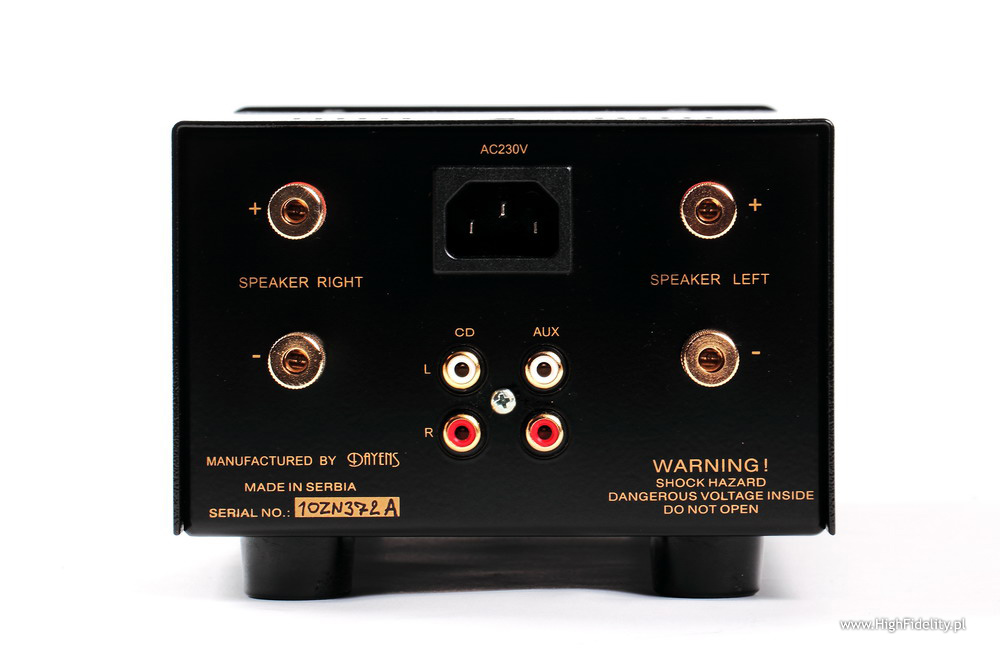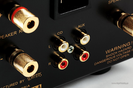 Tył jest równie minimalistyczny – to dwie pary wejść RCA (CD i Aux) oraz dwie pary wyjść głośnikowych. Gniazda są średniej jakości. Jest także gniazdo sieciowe IEC. Umieszczono je, moim zdaniem, niezbyt szczęśliwie, bo tuż nad wejściami liniowymi. Taka bliskość napięcia sieciowego i sygnału audio jest bardzo niepożądana. Dlatego należy zadbać, aby kable się ze sobą nie stykały i najlepiej, żeby biegły z daleka od siebie. Ja w tym celu, tj. żeby odseparować od siebie interkonekty i kabel sieciowy, zastosowałem… kupiony w aptece pumeks. Rozdzielił kabelki i nie wyglądał bardzo źle. Urządzenie stoi na czterech gumowych stopach.