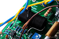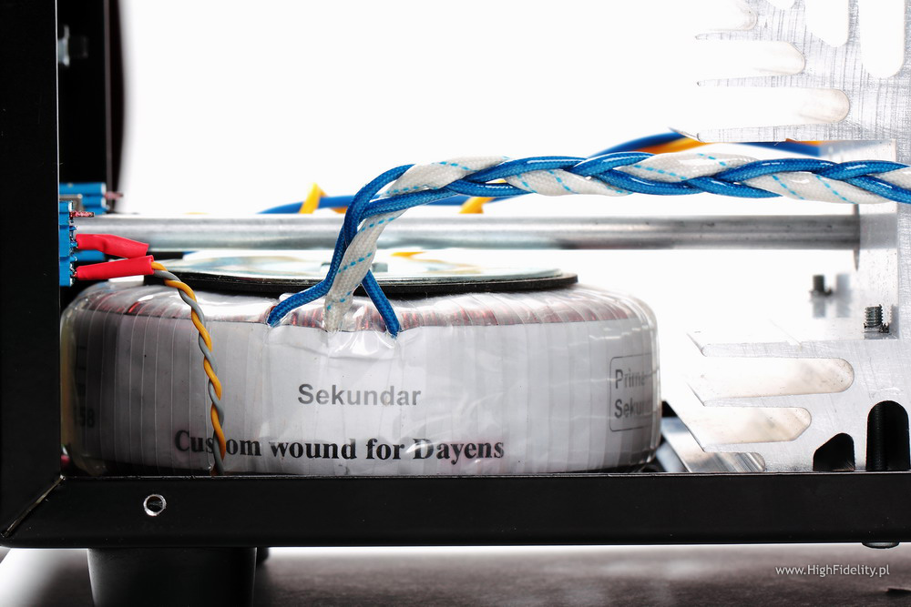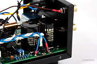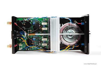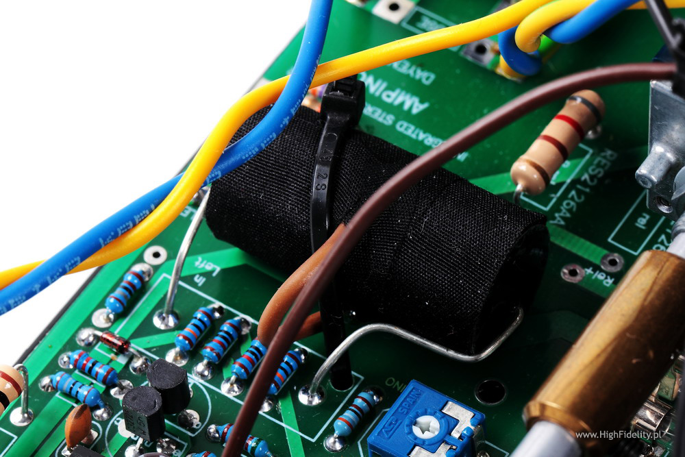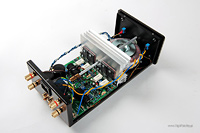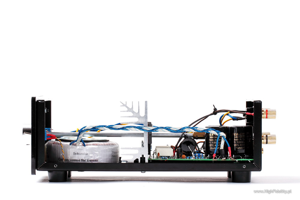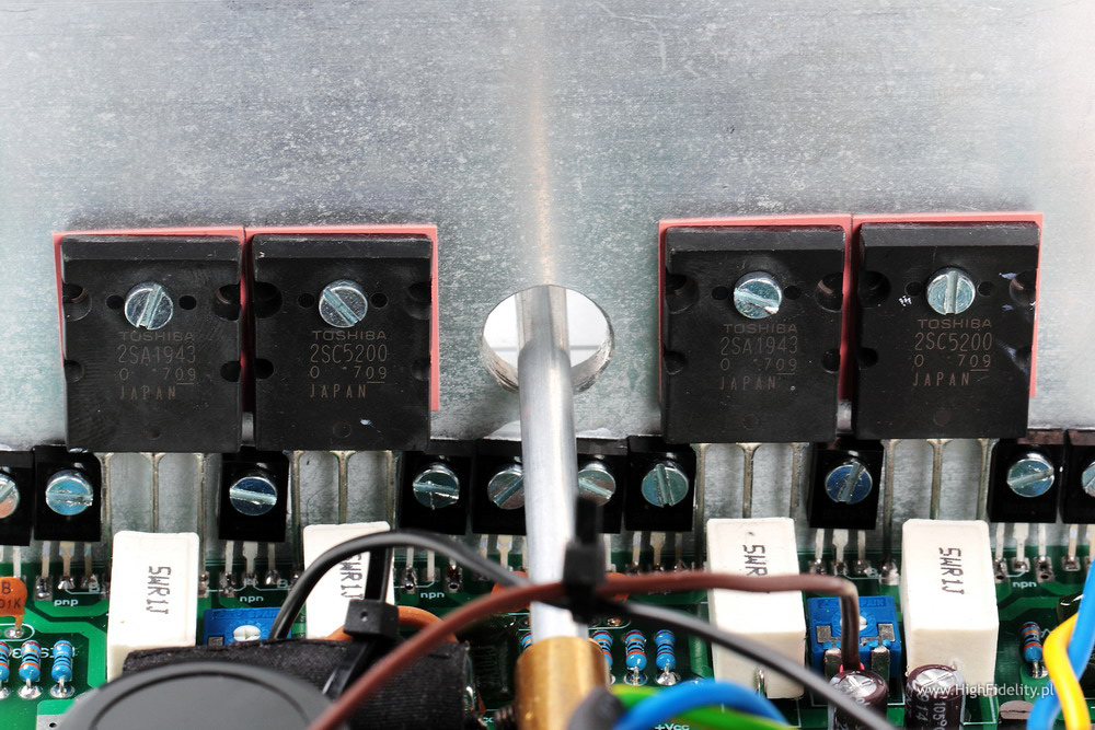 Układ jest w całości tranzystorowy, a na końcu, w trybie push-pull, w klasie AB, pracuje para bipolarnych tranzystorów Toshiby 2SA1943+2SC5200. Tranzystory te, wraz ze sterującymi, przykręcone są do radiatora tupu „choinka”, oddzielającego tę część od, umieszczonego przy przedniej ściance, sporego transformatora zasilającego o mocy 100 W. W radiatorze wycięty jest otwór, przez który przechodzi oś, łącząca gałkę siły głosu z wlutowanym tuż przy wejściu potencjometrem Alpsa „Blue Velvet”. To idealna sytuacja, ponieważ skraca ścieżkę sygnału do minimum. Tym bardziej, że to wzmacniacz z przedwzmacniaczem, w którym potencjometr umieszczono na jego wejściu. Tuż przy potencjometrze, zaraz za (złoconymi) wejściami RCA widać mały przekaźnik, którym zmieniamy aktywne wejście. Tranzystory oraz zaciski głośnikowe łącza bardzo dobre kable Mundorfa ISWG105 ze srebra i złota.