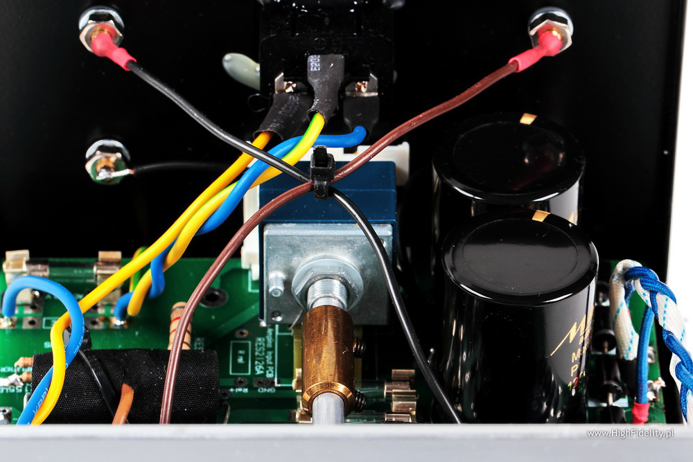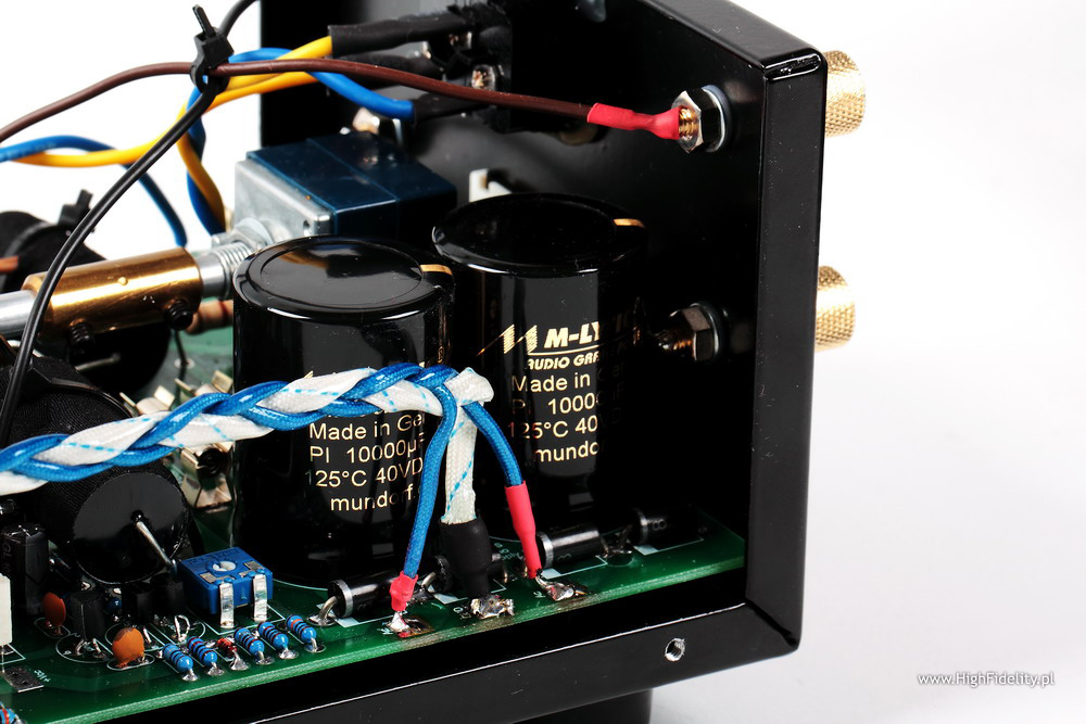 Jak mówię, całość wygląda bardzo, bardzo ładnie i wzmacniacz mógłby pewnie kosztować ze dwa razy więcej i wciąż można by podziwiać to, jak za te pieniądze udało się zmontować urządzenie z tak dobrych elementów. Patrząc na zdjęcia egzemplarza, który miał w teście Srajan Eaben widać, że projekt z czasem ewoluuje – teraz mamy lepsze kondensatory w zasilaczu, lepsze sprzęgające itp. Lepiej wykonana jest też oś łącząca potencjometr i gałkę.