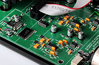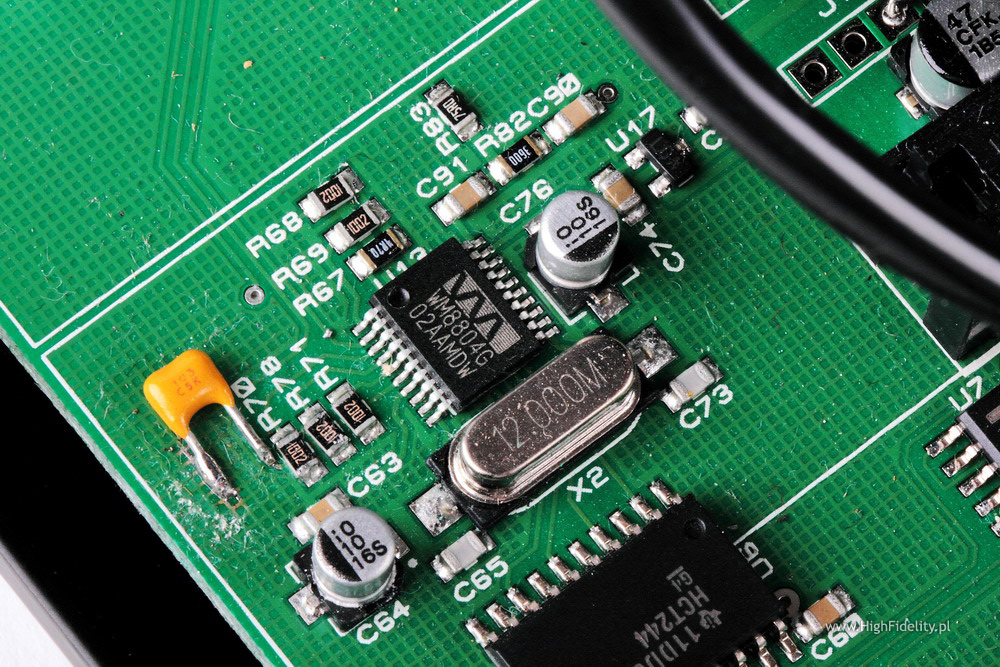Pod spodem jest też duża płytka drukowana. Sygnał biegnie jednak bardzo krótką ścieżką. Na wejściu jest przetwornik cyfrowo-analogowy Wolfson Microelectronics WM8804, obok którego, niemal na nim jest zegar taktujący. Zamianą prądu na napięcie (I/U) zajmuje się czterokanałowy układ scalony Burr Brown OPA4134. Na wyjściu, w sekcji wzmacniającej i buforującej są kolejne układy, też BB, OPA134. Jedna para wyjść kluczowana jest przekaźnikami – najwyraźniej są aktywne tylko w układzie bi-ambing.