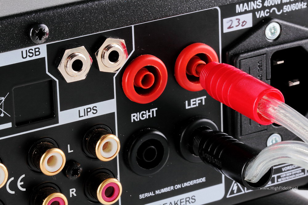 Z tyłu mamy pięć wejść liniowych – jedno zbalansowane i cztery niezbalansowane. Są też dwa gniazda komunikacji systemowej LIPS oraz dwie pary gniazd głoskowych – to gniazda BFA, w więc „dziury” w obudowie. Myślę, że gniazda i wtyki BFA to jedne z najlepszych tego typu elementów, jakie są na rynku i odmowa ich stosowania przez przeczulonych producentów (może poza Cyrusem i Naimem) to błąd.
