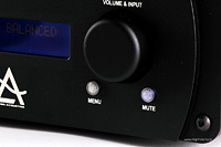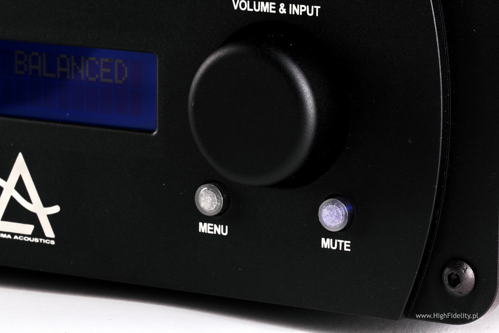 Front wzmacniacza jest podobny do CD – pośrodku też jest wyświetlacz, podobny do tego w odtwarzaczu, choć ma nieco inny odcień. Pokazuje się na mim siła głosu, wybrane wejście oraz bargraf pokazujący siłę głosu. Z boku jest mała gałka – możemy zmieniać nią siłę głosu lub, po naciśnięciu, wejście. Pod nią mamy dwa podświetlane guziki – ‘mute’ oraz ‘menu’. Wybierając ten drugi zmienimy np. nazwę wejść, albo ustalimy, które będzie pracowało w trybie „unity gain”, co pozwoli wpiąć wzmacniacz w system kina domowego. Po drugiej stronie wyświetlacza umieszczono dwa gniazda mini-jack fi 3,5 mm – jeden to wejście liniowe, a drugi to wyjście słuchawkowe. I jest jeszcze jeden podświetlany przycisk, ‘standby’.