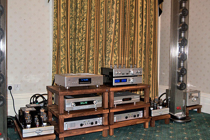 Z uwagi na swą transformatorową konstrukcję preamp ten oferuje możliwość bi oraz tri ampingu przy użyciu swych trzech zrównoleglonych wyjść, z czego skorzystali prezentujący. Był to również pierwszy raz, kiedy miałem przyjemność usłyszeć kolumny Anthony Gallo Reference 5LS prawidłowo z amplifikowane i brzmiące absolutnie rewelacyjnie. Oczywista była też przewaga Electry nad pasywnym Silverstonem. Charakteryzująca się dźwiękiem bardziej krągłym i pełnokrwistym, zaprezentowała się w systemie niezwykle żwawo i dynamicznie, pomagając tranzystorowych końcówkom mocy obsługującym średnicę i górę spasować charakter brzmienia z pracującym w dolnych rejestrach macierzystą parą monobloków M-75 opartą na lampach z rodziny KT. Równie pięknie zaprojektowanych i brzmiących, sylwetką przypominających nieco koreańskie Emillé Labs.