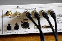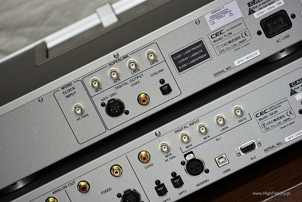 Tył urządzenia wygląda przebogato – ilość wejść cyfrowych jest ogromna, choć można by dyskutować czy proporcje są najwłaściwsze (to zawsze będzie zależało od punktu widzenia konkretnego użytkownika). Mamy bowiem tylko jedno wejście S/PDIF koaksjalne, ale dwa optyczne (plus jedno na froncie). Normalnie rzecz biorąc osoba, która ma jakiś transport płyt CD, oraz chce słuchać muzyki z plików i należy do grupy osób, które uważają, że zazwyczaj najlepsze brzmienie daje zastosowanie konwertera USB/coax (zakładając, że źródłem sygnału jest komputer), oczekuje, że DAC będzie miał dwa wejścia koaksjalne. Tyle, że jeśli transport CD będzie produktem CEC-a, to będzie go można połączyć z TL 3N tzw. „Superlinkiem”. Do tego połączenia potrzebne są aż cztery kable zakończone wtykami BNC (dostarczane z przetwornikiem), by osobno przesyłać dane audio i sygnały zegarów taktujących (przy połączeniu kablem koaksjalnym czy AES/EBU wszystko jest przesyłane razem, co zwiększa podatność sygnału na jitter). Jednym kablem łączymy ze sobą gniazda oznaczone w obydwu urządzeniach MCK (Master Clock) – transport tym kablem otrzymuje sygnał z zegara przetwornika – wspólne taktowanie umożliwia pełną synchronizację przesyłu danych między urządzeniami. Drugim gniazda BCK (Bit clock) – to połączenie umożliwia np. identyfikację częstotliwości próbkowania sygnału. Trzecim gniazda LRCK (L/R clock) do przesyłu informacji z transportu do DAC-a identyfikujących prawy i lewy kanał. I czwartym gniazda DATA - tym kablem wysyłane są same dane audio. Jeśli więc mamy transport C.E.C.-a to jedno wejście koaksjalne może wystarczyć. Imponującą gamę gniazd uzupełniają: port USB (typ B, plus wspomniane wcześniej mini na froncie), AES/EBU, oraz wejście dla zewnętrznego zegara. Mamy również cztery pary wyjść analogowych – 2 x RCA i 2 x XLR, zarówno niezbalansowane jak i zbalansowane występują bowiem w wersji ze stałym i regulowanym poziomem sygnału.
