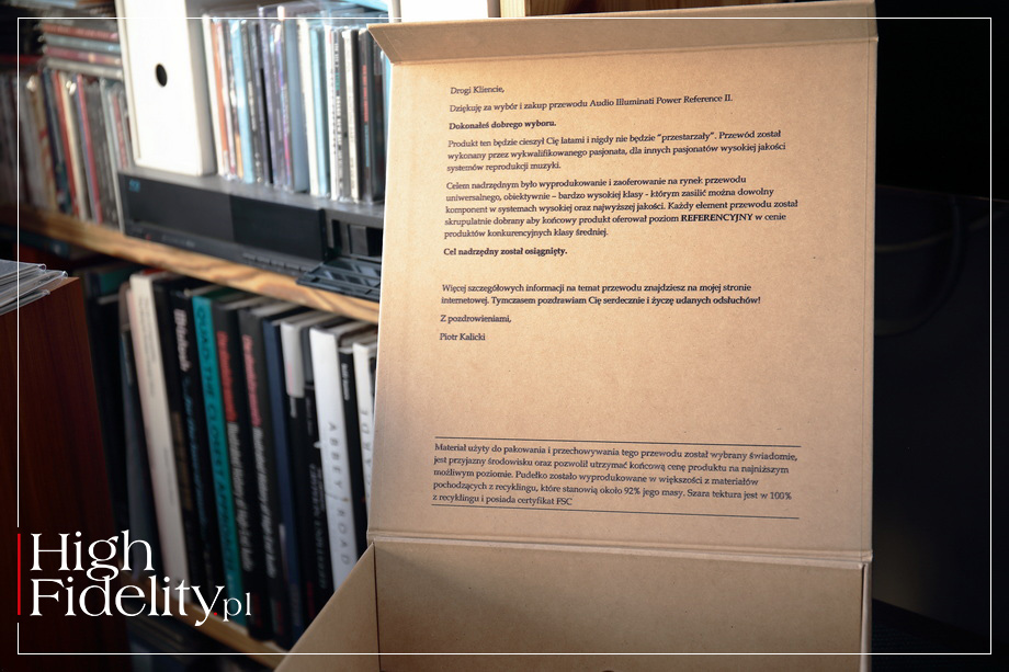 Looking at these requirements and knowing the modus operandi of Mr. PIOTR KALICKI, one can say that Audio Illuminati cable is a product of a manufacturer. But it should be noted that his activity balances the line between DIY and business activity, where these two ways of presence in the audio industry blur. Indeed, cable manufacturing is a hobby for Mr. Piotr, not his main occupation. According to his website, he has offered various versions of the Power One cable, and even non-terminated sections of the cable. His new product, however, looks more polished and thoughtful in terms of its promotion, as it comes in a very cool, decently prepared box, and the product itself is repeatable. ▌ Power Reference II SIMILARLY AS BEFORE, first there was an email, in which the designer informed me that he had an idea for a new cable and would like to present it to me. As he wrote, the first and only product he offered under the Audio Illuminati brand "was well received by the market" and some 140 units were sold in Poland and around the world. However, as he adds, he muted his activities relatively quickly, sold out of material and "the audio adventure ended there." Or at least that's what he thought. However, designers are a special group of people. They are always thinking about new solutions, building new products in their heads, coming up with ideas. So sooner or later Mr. Kalicki had to return to cable production. The idea for the new cable was to make it affordable and much more versatile than the previous one, about which the designer writes: "It was a good cable, but very defined, very specific, great in some respects, but questionable in others. It was not universal and worthy of a being recommended in every situation. And further: