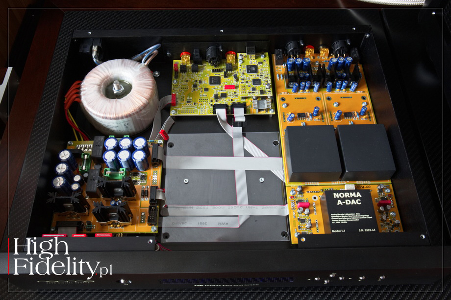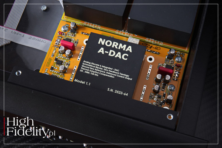 The material for the album was being written for quite a long time, between 2023 and 2024, and was recorded in several places: at Free Sky Music Studio, Okolitza Studio, Studio Rivendell and Coverius Studio. What binds it together, however, is the person of the sound engineer who recorded, mixed and mastered the album - Piotr Mankowski, head of Coverius Studio. He was also co-producer of the album, along with Tomasz Budzynski. The album was released in digipack form with a booklet slipped into a side pocket. It's a largely “economical” release, unfortunately becoming more common in recent times. It relies on reaching for unvarnished black and white paper and lacks the essay that used to accompany album releases. Nevertheless, it looks really elegant. The booklet includes lyrics and photos of the band. The album was released on January 17th of this year and was also available in an autographed version by the artists; we review this version.   Miroslaw Pęczak, in a review in Polityka magazine, gave the album only three stars out of a possible six (3/6) - I don't think this is a fair rating; more → HERE ˻PL˺. In my opinion, this is a very good, mature, thoughtful album. And, in addition, recorded with particular taste. Already the introduction to ˻ 1 ˺ Wołania says it's good - it's a low, dense entry with breath. After the entry of the guitars at 0:50, it compresses and compacts a bit, but not as much as I would have expected. The sound and space open up again when Budzynski's vocals come in. It's a clean and nice vocal. One can hear that the recording was made in small rooms, with separately laid tracks of each instrument. However, the boundary between sterility and purity of traces is not crossed. That's why this album is so good to listen to. It's sharp, it's jazzy and powerful, yet with an excellent tonal and dynamic balance. The guitars sound very good, but the percussion, usually lost in the run-up on hard rock albums, is even better recorded. Bravo! ● » Sound quality: 7-8/10 THERE IS NO HIDING the fact that the DAC-2 was designed with love in its heart for Compact Disc. Norma's boss spoke of his preference, during a visit to “High Fidelity,” and also reiterated it in correspondence we later exchanged. That's why the main inputs are RCA and AES/EBU. We buy a nice CD transport, and quite a few can be found on the market, and we have a great system.   But it's also not that the USB input is flawed. The tested DAC, however, is resolving and true to what it does, and momentarily shows what the difference between physical media and a file is. Once we accept this, then we find that we can buy a file transport as well and enjoy access to streaming, using a service of our choosing. It will be a slightly less dynamic sound and more tonally constricted And yet... It sounds very good. Still dense, low, and warm. This was the case with both the country-drenched Something We Regret of WILLOW AVALON, and the rockin', straight-out-of-the-80s playing in the track Surrender Your Gender by super group RED HOT ORG. In Power, a track by South Korean rapper Kwon Ji-yong (Hangul: 권지용), better known by his stage name G-DRAGON, the bass hit hard, low, pulling everything forward. Know this, however, with more refined material we will reach a place where the discrepancy between file and CD will not be particularly large. An anniversary box set of A Ghost Is Born by the band WILCO has just been announced, so I couldn't help but reach for it. It is available on Tidal in 24/192 FLAC files, which sounds very, very mature. So did the DAC-2, which showcased Jeff Tweddy's vocals right in front of me, tightly, densely, and his guitar, as in 2 ˺ Hell Is Chrome, with just the right amount of “whizz” and distortion. ▌ Summary DAC-2 IS NOT PERFECT, because it cannot be. There is no such thing, and besides, it is somehow not a particularly expensive DAC. At the very bottom it somewhat “lets go” of bass focus, nor does it focus the sound above as well as the reference player. It prefers a warm, dense midrange, although it does not forget its extremes. It resembles, in truth, the sound of the Lumin T3 file player. That is, it puts it all together in a neat whole that smoothly plays any music. Given its price, however, it must be said loud and clear: this is a very good product, prepared by a man who loves what he does and, as a result, does it well. Which become clear as soon as you start listening to it. We get a DAC that plays low, warm, dense but also dynamic and with a strong treble. We're talking high resolution and surprisingly good selectivity – which, for such a dense sound, is a major achievement. Bass is strong, filled, low. And full rather than punchy. The highs have a lot of weight and energy, but they too sound in a rather sweet way. This gives a sound that a few years ago was reserved only for the most expensive digital equipment. ● ▌ Design AS WE WERE TELLING YOU, the electronics of the tested D/A Converter are entirely Norma's proprietary development and are identical to what we get in the company's CD players. This is, in fact, the CDT-2 player minus the drive. When you take off the top panel, you can see the place for it, blanked off with a transparent plastic plate. The electronics and power supply are identical. A board with a circuit that converts this signal to IIS was placed in the USB input. It is plugged into a larger board with the other digital inputs; impedance matching transformers are mounted in front of each of them. On a separate, large board, we find the DAC circuit. This circuit is called A-DAC, where 'A' refers, as the designer says, to “analog.” His idea, he adds, was to make digital sound as much like analog as possible – not LP, but just analog. The technology is a secret. All that is known is that it is a “combination of digital and analog circuitry” and that it is a multi-bit circuit, not a sigma-delta. The module in question was full