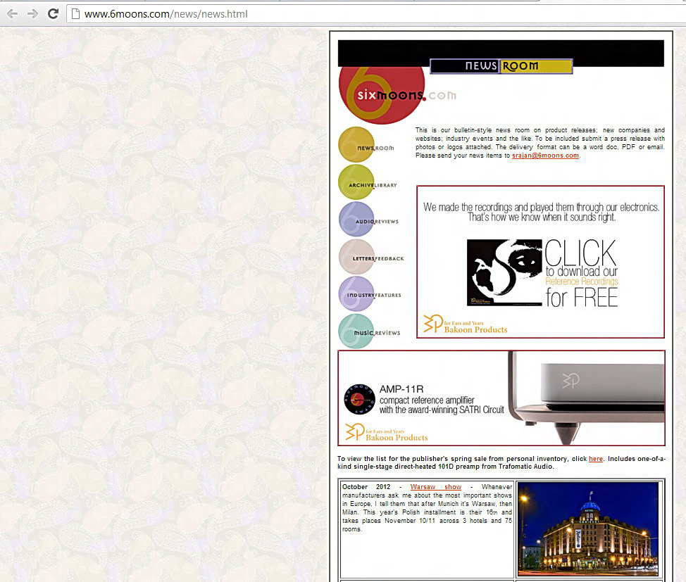 Jak się ułoży rynek prasowy? Co to oznacza dla audiofilów? Na te i na kilka innych pytań postaram się odpowiedzieć już w przyszłym miesiącu. Tu i teraz warto zauważyć, że wydawcy dostrzegli potencjał tkwiący w Sieci i chcą wykroić z niego swój własny kawałek tortu. "High Fidelity" życzy wszystkim powodzenia! Ostatecznie im więcej informacji na temat danego produktu, tym lepiej. II. "6moons.com" A będąc przy pismach internetowych, dwa słowa o największym tego typu piśmie audio na świecie, szwajcarskim (tam jest w tej chwili zarejestrowane), prowadzonym przez Srajana Ebaena magazynie "6moons.com", z którym "High Fidelity" współpracuje od lat.