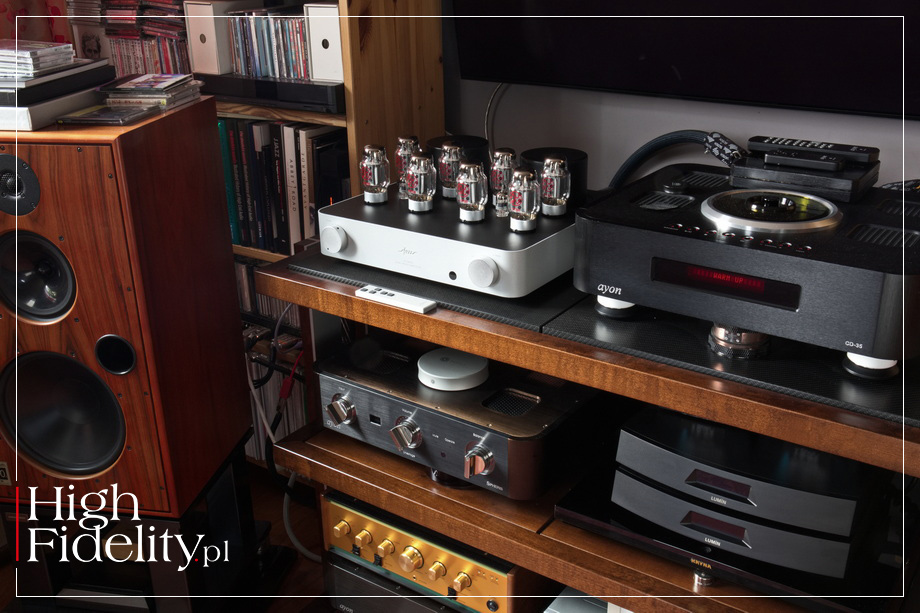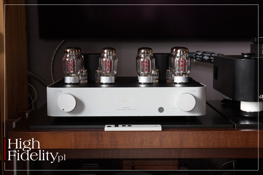 As one reads further, tubes in this device are protected electronically, rather than by traditional safety fuses. This, together with the anode voltage delay system, should reassure those who associate tube amplifiers with difficult operation and failure rates. The same goes for the automatic bias control and correction system, which, according to the manufacturer, “ensures optimal sound quality and eliminates the need for adjustment”.   As you may have noticed, the device is a dual-mono design. This means that both channels are routed independently. This reduces so-called “cross-talk”, i.e. the influence of one channel's signal on the other. Usually, this is an incomplete system of this type, with a common power transformer, possibly with separate secondary windings for the left and right channels. In this case, it is true - there are two separate power and amplification paths. FEATURES • The tested Fezz Audio amplifier’s looks are very attractive. I know, I've already said that, but it's impossible to ignore such a good design. It works even in a project as big as this one. Big, meaning with the top panel filled with tubes. The device is a classic audio amplifier, i.e. there is no digital-to-analog converter or file player on board. It offers three line inputs, which seems like reasonable restraint in this day and age. There is also a direct input to the power amplifier stage. It can be used to connect a source with adjustable output level if you want to bypass the potentiometer in Olympia, or to include it in a home theater system. But in the future, you can also buy an external preamplifier and use Olympia as a power amplifier – a high-power one, at that. And there is also a line output for a sub-woofer and a switch to disconnect the ground from the housing. Under the cover plate to the left of the RCA input and output sockets, there is a slot for a Bluetooth 5.0 receiver module. Apart from the electronic protection circuits for the tubes, this is the only concession to modernity. Once the module is in place, it will allow wireless transmission of a digital signal from a smartphone, tablet or computer. This will be a compressed signal, as is the nature of this type of connection. Version 5.0 offers a fairly large range of up to forty meters indoors and up to two hundred meters outdoors, which is completely sufficient for comfortable use of music services. The device can be controlled with two large and comfortable knobs on the front panel or with a remote control. After major problems with previous remote controls, the company switched to a new platform offered by another subcontractor. The new remote control allows you to adjust the volume, select the source and turn the amplifier on and off. There is also an option to purchase a set of “Premium” tubes, which offer even better performance than the basic ones - they are sourced from Genelex. A protective cover for the tubes is included in the set. It used to be available as an option, but here it is a standard feature of the amplifier. You have to assemble it yourself by screwing the acrylic front onto the metal element. It is not very handy, but it works.   REMOTE • The new remote control works in the classic way, using infrared. The characteristic “window” with the receiver had to be added to the front panel of the amplifier. The remote control housing is made of milled aluminum, and the electronics are manufactured for Fezz, it is not an “off-the-shelf” system. The buttons are reliable, even though they tend to “float” in the holes. There is one thing missing: a “Mute” button. The remote control is only available in silver. I wonder if one could order it in the same color as the amplifier for an additional charge? ▌ SOUND HOW WE LISTENED • The Fezz Audio Olympia integrated amplifier was tested in the HIGH FIDELITY reference system and compared to the Solution 710 power amplifier, paired with the Ayon Audio Spheris III tube preamplifier.   The tested device was placed on the Finite Elemente Master Reference Pagode Edition Mk II rack. The source in this system were the Ayon Audio CD-35 HF Edition SACD player and the Lumin T3 file player. With the Ayon Olympia was connected using the Siltech Triple Crown RCA interconnects, and with the Lumin via Siltech Master Crown. The Harbeth M40.1 speakers were connected to it using Crystal Cable Art Series Da Vinci cables. The amplifier was powered using the Harmonix X-DC350M2R Improved-Version cable. It should be added that the speakers were connected to SPEC RSP-901EX speaker filters, which the manufacturer describes as a Real-Sound Processor (more → HERE). | » RECORDINGS USED FOR THE TEST ⸜ a selection