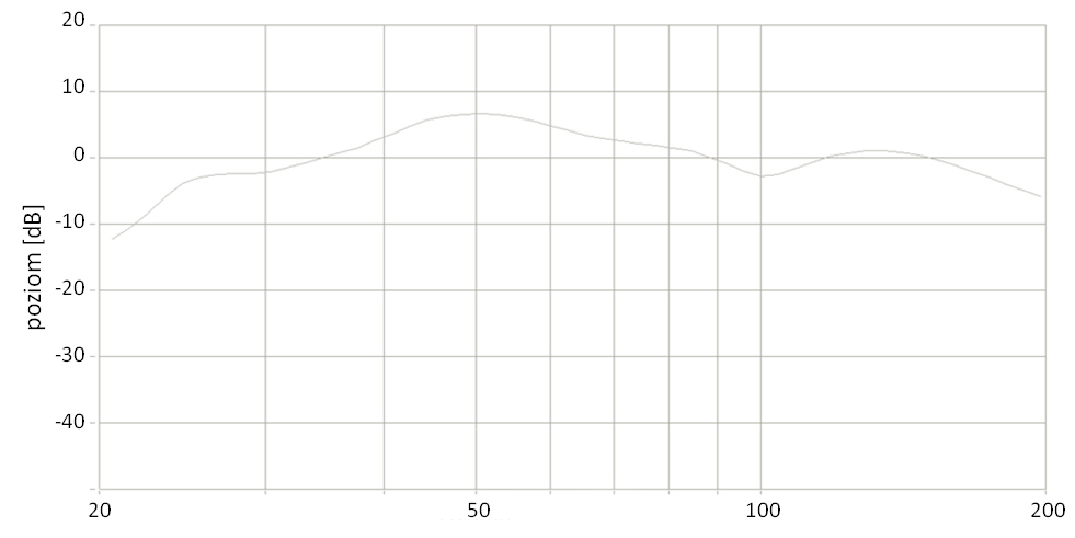 Dla obszaru 20 – 200 Hz wykonano oddzielne pomiary wykorzystując głośnik niskotonowy. Jak widać na poniższym wykresie charakterystyka wykazuje pewne fluktuacje zwłaszcza w okolicy 50 Hz, a obniżenie przy 104 i 195 Hz to efekt rezonatorów Helmholtza.