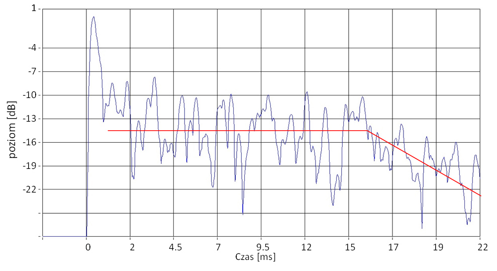 Jak widać na wykresie sygnał odbity jest średnio o 14 dB niższy od sygnału bezpośredniego, co jest wynikiem wystarczającym. Oznacza to, iż odbicia będą 25 razy słabiej słyszalne niż dźwięk wprost z kolumny.