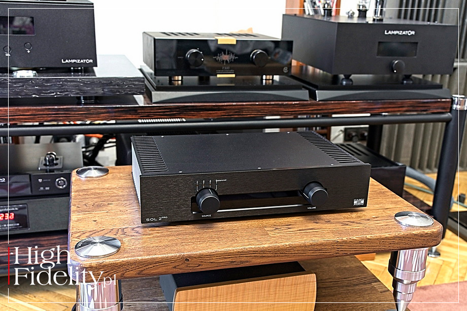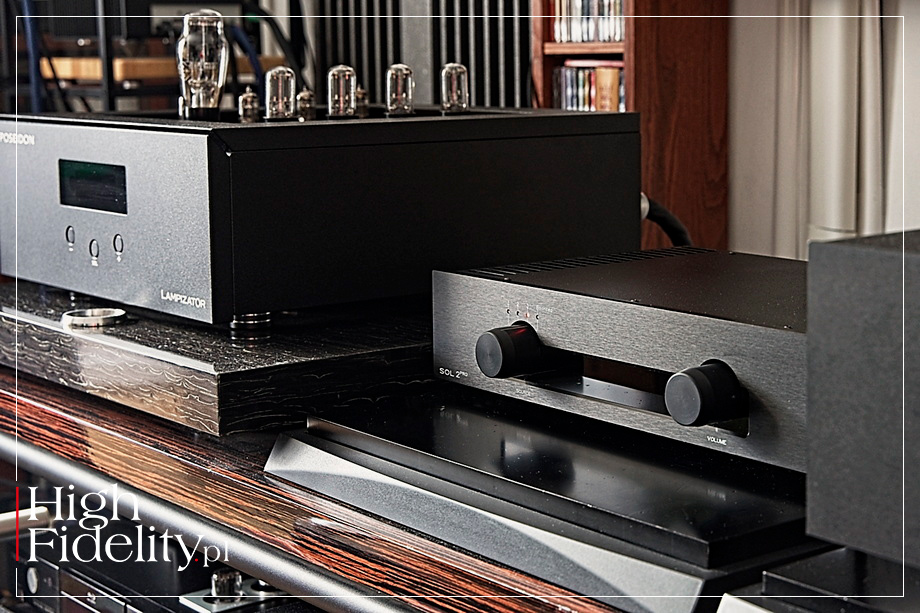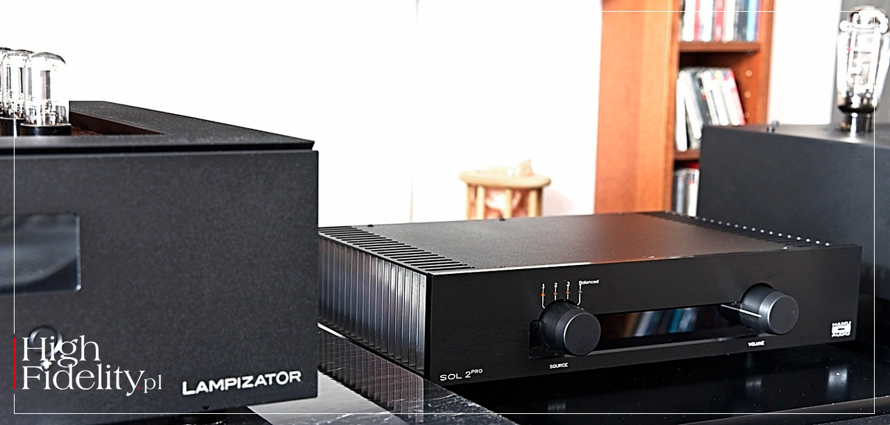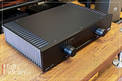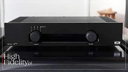 All this contributes to the uniqueness of the tested amplifier. On the one hand, it has quite a lot of power and knows how to use it, in other words, it behaves like a thoroughbred solid-state amp. On the other hand, however, it is a modern transistor, one in which musicality, fluidity, and natural smoothness are equally important. And yes, today, which was difficult to predict fifteen or even ten years ago, most solid-state amplifiers perform in this manner. The thing is that their creators no longer focus solely on detail, precision, transparency, cold neutrality, power, and dynamics of sound, but combine them with fullness, smoothness, and fluidity, and that cold neutrality has been replaced by (actually warm, dense) naturalness. And although the Sol 2 Pro does not cost much, it, like amplifiers costing tens and hundreds of thousands PLN, offers this very character of sound. ▌ Summary OK, SOL 2 PRO IS NOT AS RESOLVING AS REFERENCE AMPLIFIERS (not to mention even more expensive ones). It's not as saturated, as dense, it doesn't differentiate recordings quite as well, and it doesn't quite match them in terms of dynamic and tonal contrasts, especially at the micro level. In short, it is not as sophisticated as with much more expensive amplifiers. It’s just that, first of all, it doesn't really matter when it comes to listening pleasure, and secondly, I'll say it again, the differences aren't as big as you might expect. To put it another way: apart from really good sound, the Sol 2 Pro offers excellent value for money! Achieving that with tubes at this price point wouldn’t probably be possible, as these require expensive transformers, chokes, etc. It would be very difficult to stay within such a budget and achieve a comparable sound quality. However, this integrated amplifier proves that you can do without tubes, and the sound is still natural and pleasant to the ear, the vocals sound real, as do the acoustic instruments, and the spatial aspects of the presentation are also good. And with all this, we also get a high energy, scale, momentum, and great PRAT. That combination of features will allow you to listen to a jazz trio, a rock band, and a symphony orchestra with equal engagement and pleasure. Sol, as the name seems to suggest, can brighten up even a gloomy autumn day for hours on end, whether you listen to it in the background while going about your daily activities or focus entirely on the music (which is really easy with Haiku), and on top of that, it will give you perhaps even double the enjoyment. I imagine that its owners will have a smile on their faces not only because of the sound, but also because they know they got it for less than 10 kPLN. It is really good and proudly Made in Poland! Well deserved ˻ RED FINGERPRINT˺! ▌ DESIGN SOL 2 PRO is a transistor-based integrated amplifier. Its dimensions and weight are not particularly impressive (450 x 350 x 100 mm and 12 kg, respectively), but its power certainly is, as it can deliver up to 105 W at 8 Ω and 180 W at 4 Ω. The manufacturer does not specify the exact distribution, but the first watts are delivered in class A, and the rest in AB. The device is housed in a rather modest-looking but well-made and finished black metal case supported by four feet. The front panel features two large knobs: an input selector and a volume control. They are accompanied by a single not too bright red power LED. The sides of the chassis are solid heat sinks that effectively dissipate excess heat. On the rear panel, next to the IEC power socket, there is a power switch. Next, you will find three pairs of gold-plated RCA sockets, and above them one pair of XLR sockets – all of which are line inputs. The set of sockets is complemented by solid, single pair of gold-plated speaker posts. An additional accessory is a neat remote control. As you may have read above, Sol 2 Pro is a continuation of the Sol line. Its design is based on an identical topology of three gain stages without feedback. The first two stages of the amplifier operate in Single Ended mode in class A, but the heart of the amplifier is the second stage, which features a single FET transistor with high bias current, which directly controls a complementary pair of bipolar output stage transistors. The same as in the Sol II model, also here Toshiba power transistors were used. However, the number of them was doubled, and thus so did the output power.