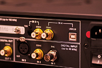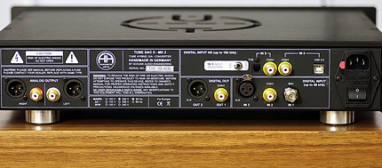 BUDOWA Accustic Arts TUBE-DAC II MK2 to robiący znakomite pierwsze wrażenie przetwornik cyfrowo-analogowy z hybrydowym stopniem wyjściowym. Urządzenie mierzące 100x482x375 mm i ważące 12 kg wyposażono w niezwykle solidną i pięknie wykończoną obudowę z aluminium w kolorze srebrnym lub czarnym o ściankach grubości 10 mm. Na froncie w układzie symetrycznym znajdują się dwie duże, srebrne gałki – (patrząc od frontu) po lewej selektor wejść, po prawej włącznik lamp w stopniu wyjściowym. Pośrodku panelu frontowego znajduje się srebrne logo, a pod nim trzy diody: (od lewej) sygnalizacja, czy na wybranym wejściu jest podawany sygnał, sygnalizacja czy lampy są włączone czy w okresie rozgrzewania, sygnalizacja wyłączenia (standby) lamp. Z tyłu umieszczono 7 wejść cyfrowych (w dwóch grupach), 2 wyjścia cyfrowe (koaksjalne i AES/EBU) oraz wyjścia analogowe zbalansowane i niezbalansowane. Dolna grupa wejść cyfrowych jest zoptymalizowana dla sygnału wejściowego o maksymalnej częstotliwości próbkowania do 48 kHz (czyli z założenie dla klasycznych transportów CD) – mamy tu 1xAES/EBU, 1xkoaksjal, 1xBNC. W drugiej grupie, umieszczonej powyżej, mamy wejścia zoptymalizowane do pracy z sygnałem o częstotliwości próbkowania do 192 kHz. Tu są do dyspozycji dwie pary wejść. Jedna para to koaksjal i wejście optyczne Toslink, między którymi znajduje się przełącznik, który musimy ustawić w jednej lub drugiej pozycji. Druga para to kolejne wejście koaksjalneoraz port USB (akceptujący sygnał do 96 kHz). Obok znajduje się jeszcze gniazdo zasilania oraz główny wyłącznik urządzenia.