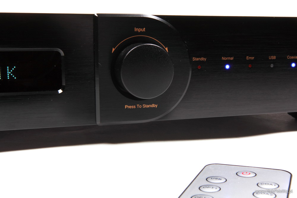 Obudowę w całości wykonano z aluminiowych i stalowych elementów, skręcanych ze sobą tak, aby tworzyły sztywny profil. Boczne ścianki z aluminium, przypominające radiatory, odsyłają wprost do urządzeń kanadyjskiego Moona, od lat stosującego ten zabieg wzorczy. Także przednią ściankę urządzenia wykonano z grubego aluminium, a pośrodku umieszczono niewielką gałkę. Wbrew pozorom nie jest to regulacja siły głosu, a zmiana wejść i przełącznik „standby”. Bo obydwu stronach umieszczono wskaźniki. Po lewej to średniej wielkości, alfanumeryczny wyświetlacz VTF, na którym odczytamy nazwę wybranego wejścia oraz, po podaniu sygnału, częstotliwość próbkowania. Umieszczone po drugiej stronie gałki diody LED wskażą aktywne wejście cyfrowe, to, czy sygnał jest zsynchronizowany, a także ewentualne błędy w sygnale. Ta ostatnia dioda jest czerwona, pozostałe – niebieskie. Tył także jest ładny, klasyczny, z wyjściami analogowymi w formie niezbalansowanej, na gniazdach RCA oraz zbalansowanej na XLR. Wejść cyfrowych jest aż sześć – to naprawdę dobrze wyposażone urządzenie. Możemy się podłączyć do wejścia USB, trzech RCA lub dwóch TOSLINK. Pierwsze akceptuje sygnał do 24 bitów i 96 kHz, pozostałe do 24 bitów i 192 kHz. Gniazda RCA wyglądają bardzo porządnie – to ładna podróbka niemieckich gniazd WBT. Wyjścia XLR są niezłocone.